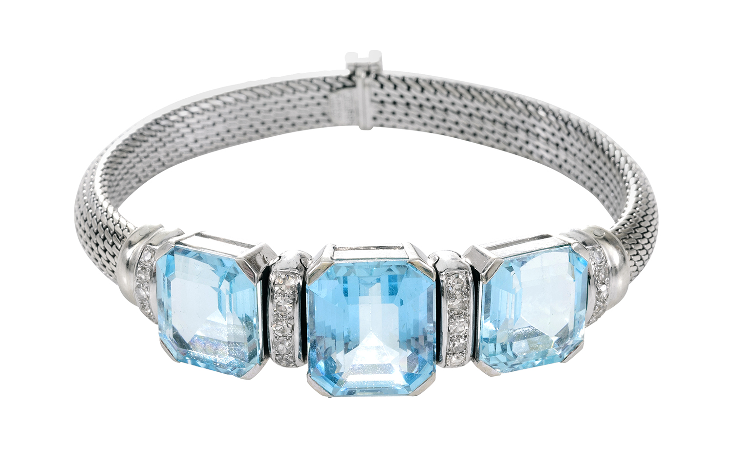 The central rectangular step cut aquamarine of 9.40cts, flanked by conforming aquamarines totalling 14.00cts, detailed by single cut diamonds, to integral bracelet bands, mounted in 14ct white gold, total length 170mm.