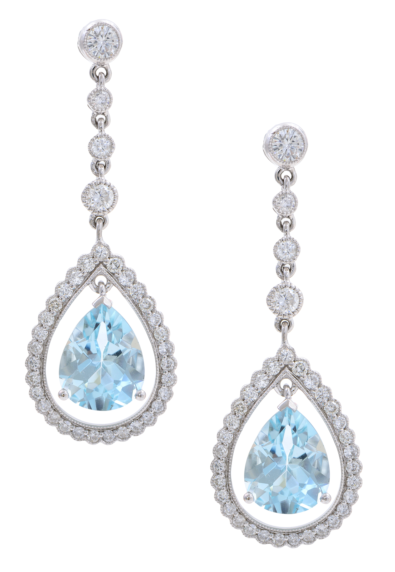 Each comprising a pear shaped aquamarine of 2.00cts, surrounded and suspended by round brilliant cut diamonds, all totalling 0.60cts, mounted in 18ct white gold.