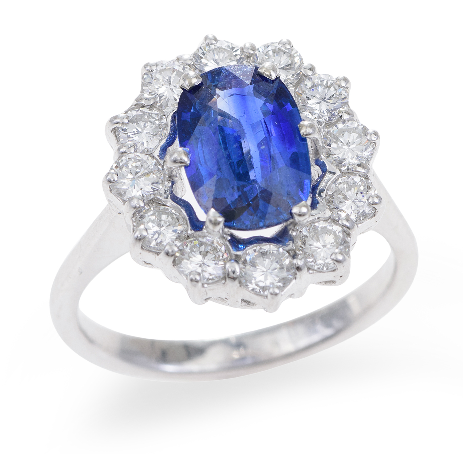 Featuring an oval cut sapphire of 1.75cts, surrounded by a border of twelve round brilliant cut diamonds totalling 1.00cts, mounted in 18ct white gold, ring size O.