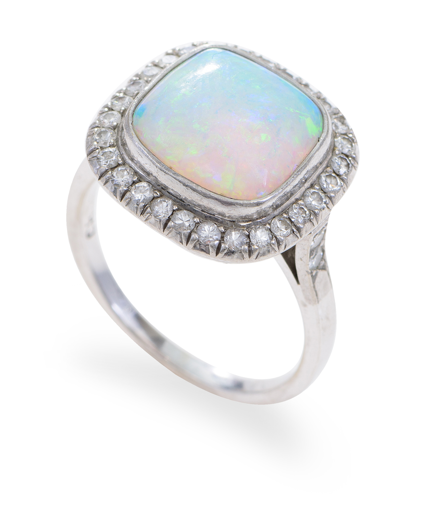 Styled as a square cluster, the opal cut en cabochon surrounded by a border of round brilliant cut diamonds totalling 0.10cts, mounted in 14ct white gold, ring size P.