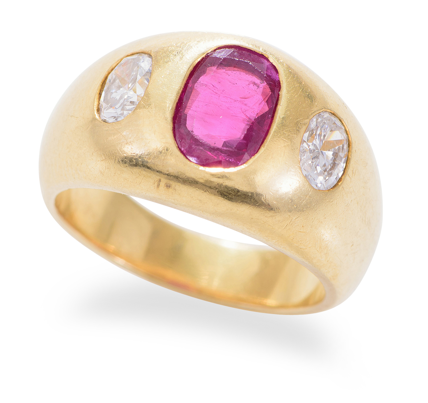 Comprising a centrally set oval faceted ruby of 1.20cts, flanked by oval brilliant cut diamonds, all set within a wide tapered band, mounted in 18ct gold, ring size .