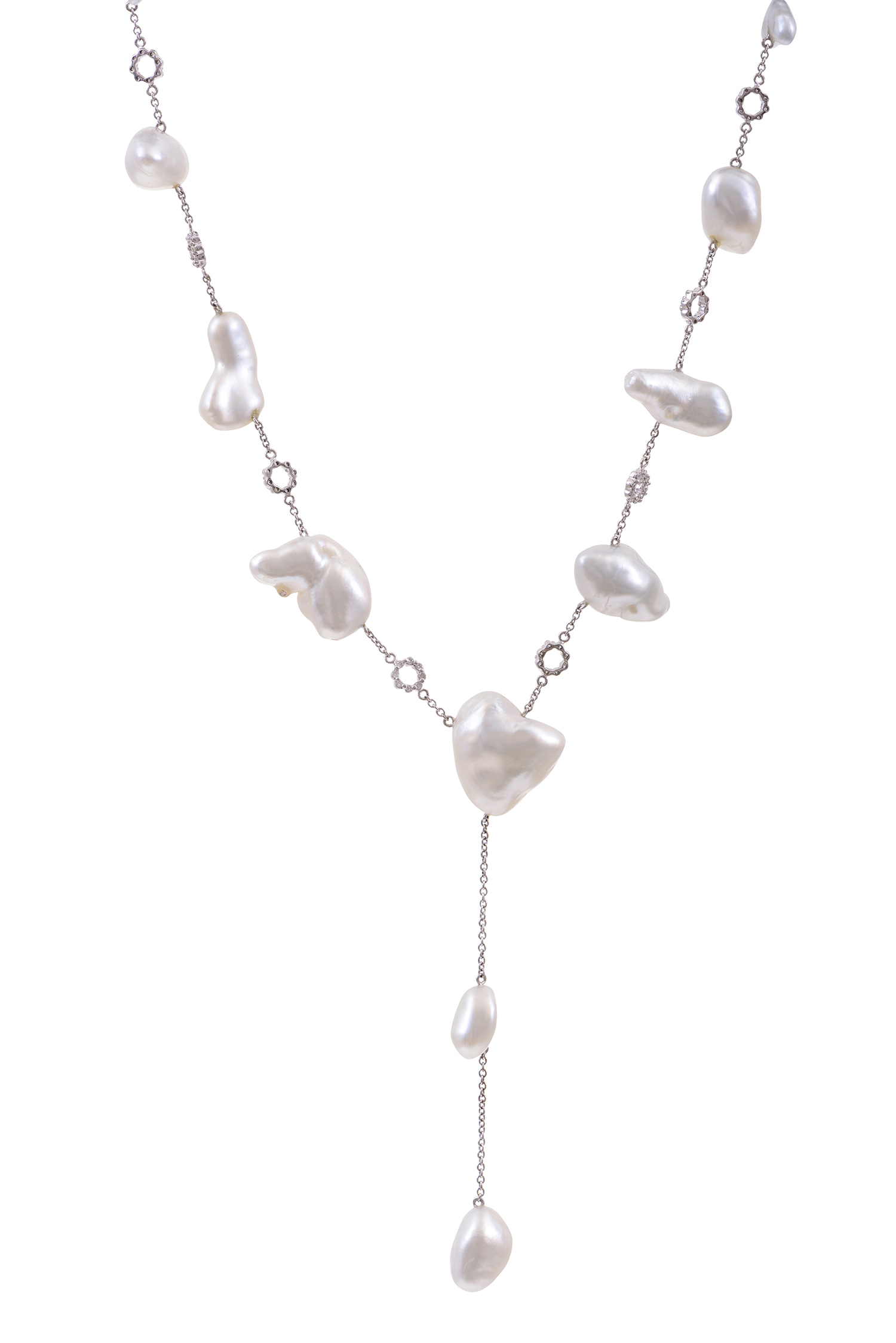 The freeform pearls of silvery white hues, suspended on a fine chain detailed with round brilliant cut diamond spacers, all mounted in 18ct white gold, total length 440mm.