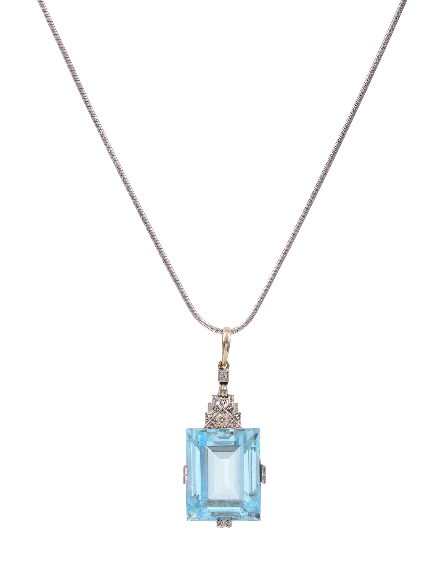 The emerald cut aquamarine of 46.15cts, with diamond detail to the mount and bale, mounted in platinum, total length 53mm.