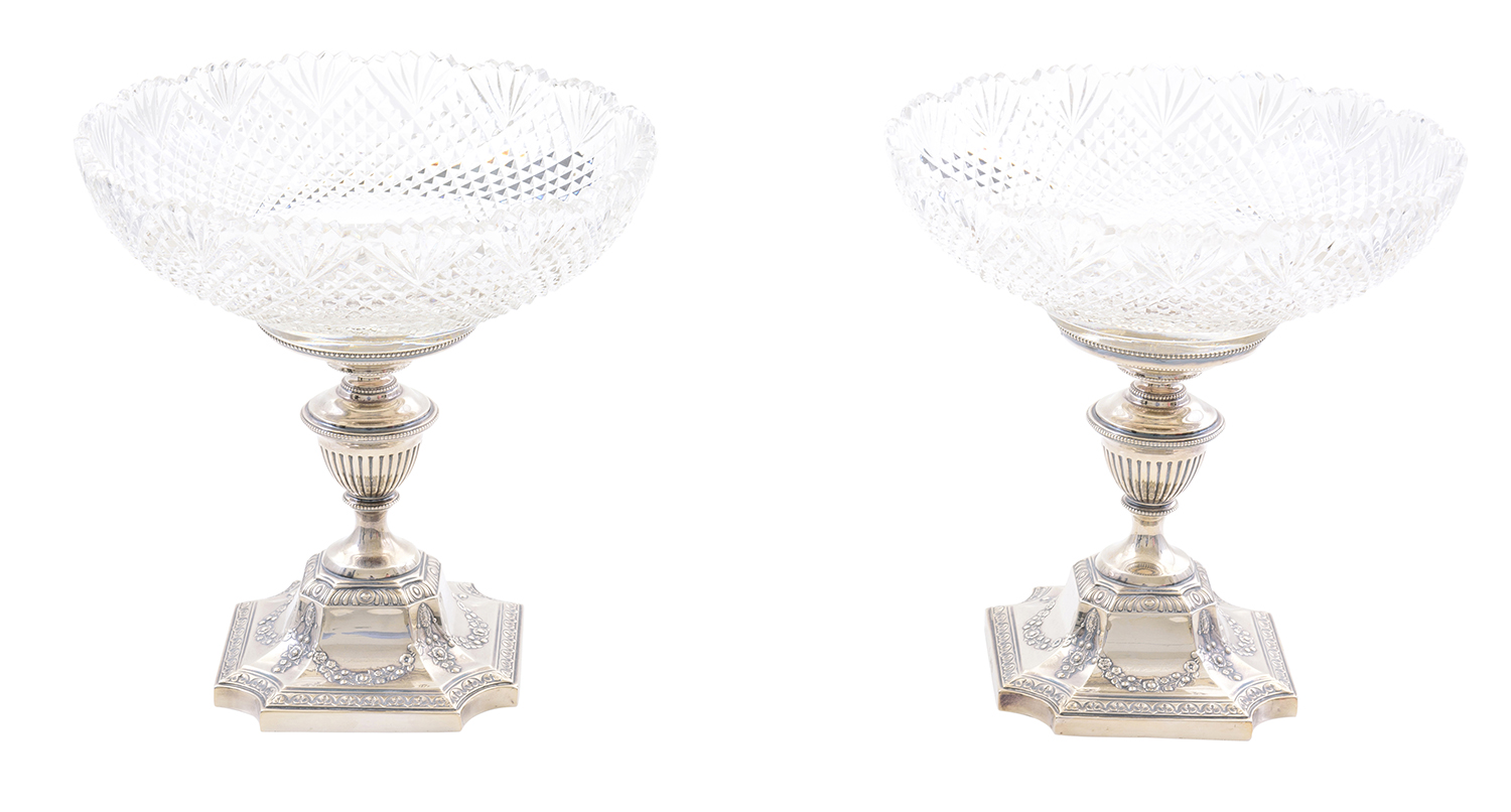 raised on a sterling silver baluster formed base, 823gms silver (bases), 23cm high