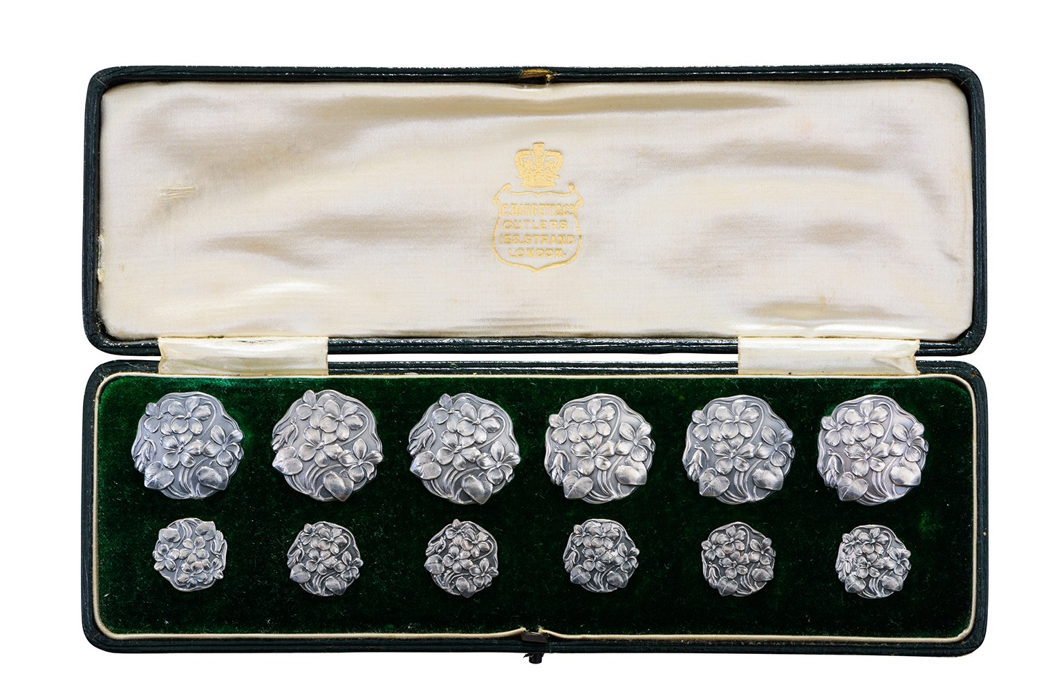 Comprising six large and six small buttons, of floral and foliate design, retailed by C.Barrett & Co, London, boxed.