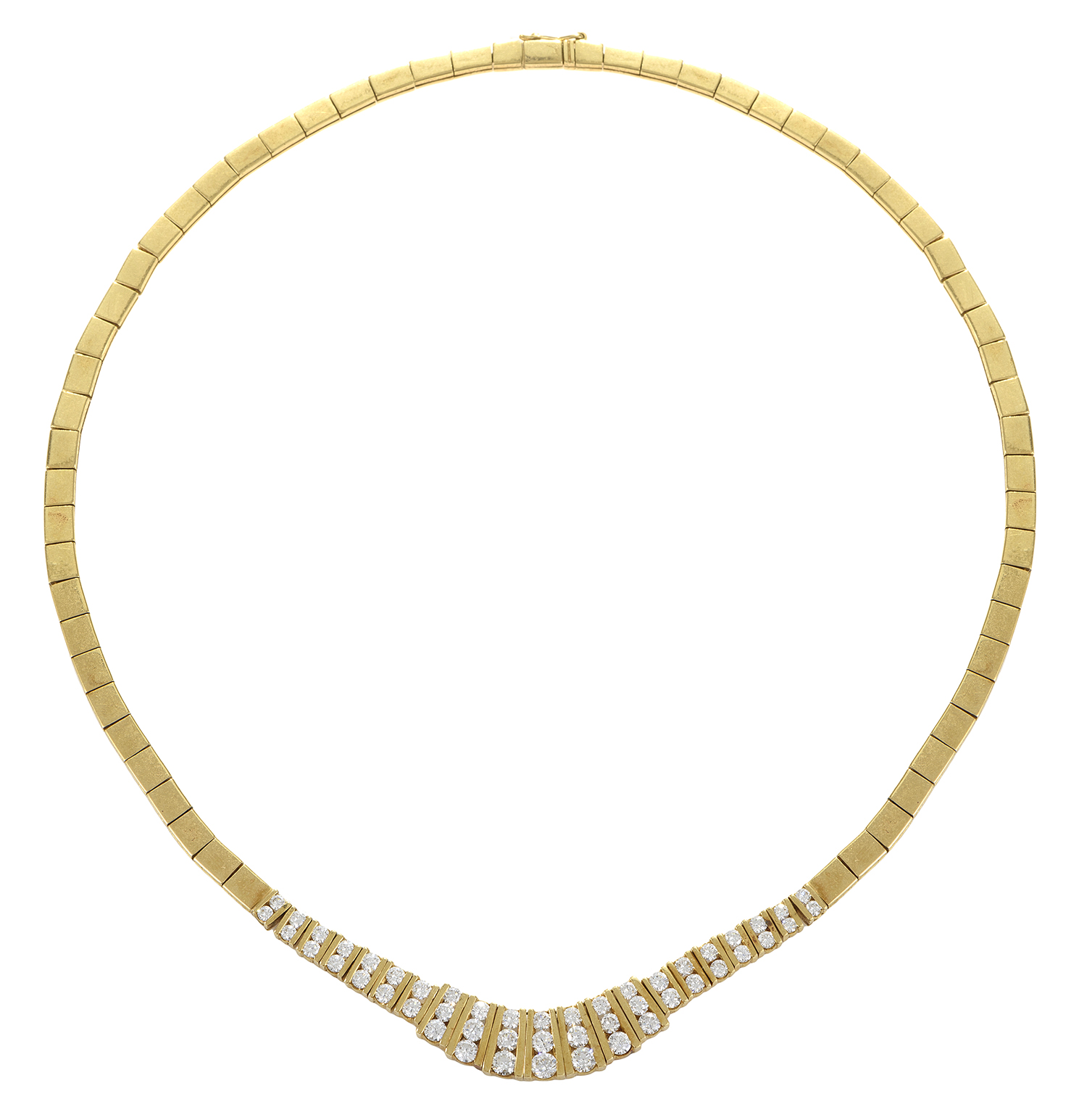 The necklace presents in overall very good condition. Very minor marks to the gold work consistent with wear. Diamonds are of a gold commercial colour and quality. Approximate total weight 30gms