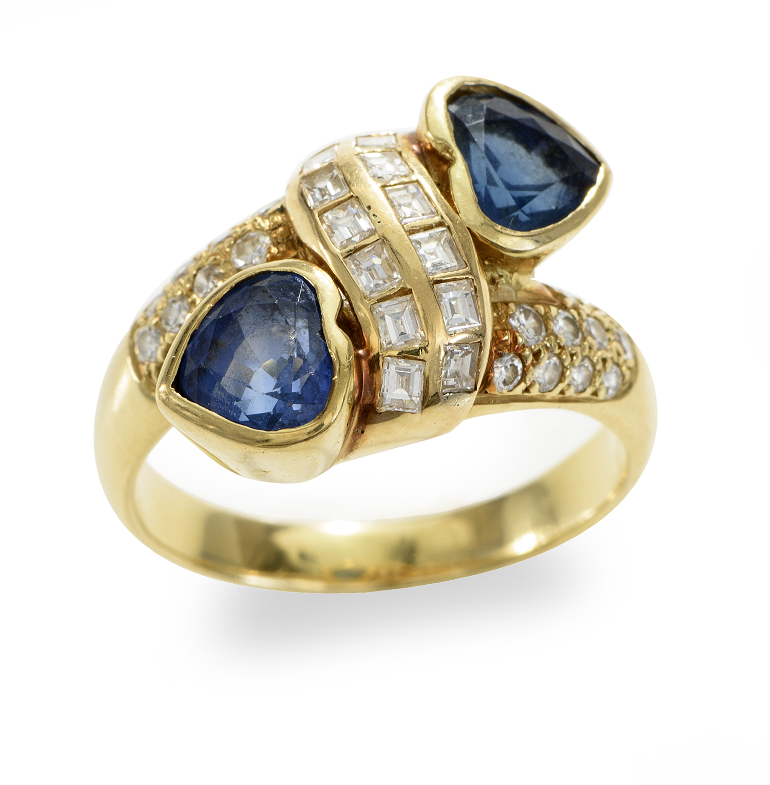 Comprising two heart faceted sapphires totalling 2.87cts, with baguette and round brilliant cut diamonds to the surround totalling 0.70cts, mounted in 18ct gold, ring size O.