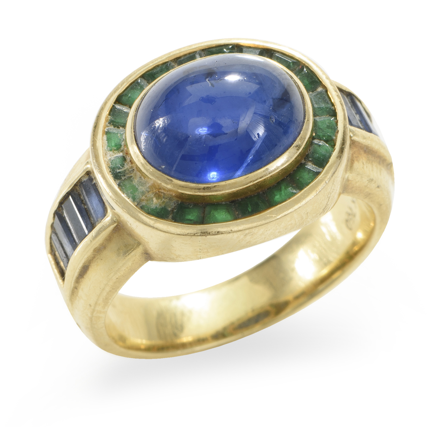 The centrally set sapphire cut en cabochon of 5.30cts, with further sapphires to the shoulders totalling 0.97cts and emeralds to the surround totalling 0.93cts, mounted in 18ct gold, ring size M.