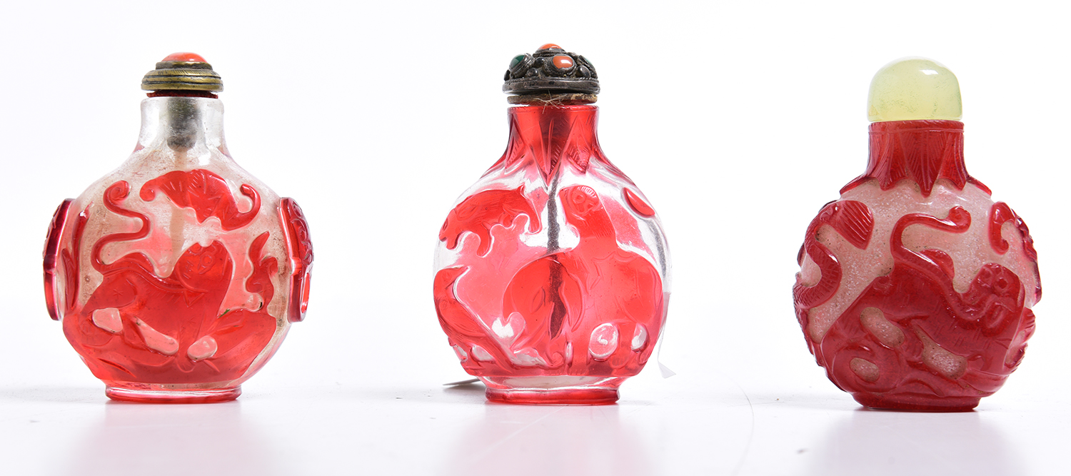 THREE PEKING GLASS RED OVERLAY SNUFF BOTTLES