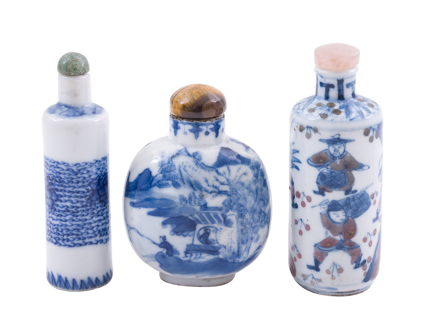 one of cylindrical form with underglazed blue decoration, another of cylindrical form with underglazed blue and copper red decoration, the other of pouch form with underglazed blue landscape decoration. Respective heights of 8.3 cm, 8.7 cm and 7.3 cm.
