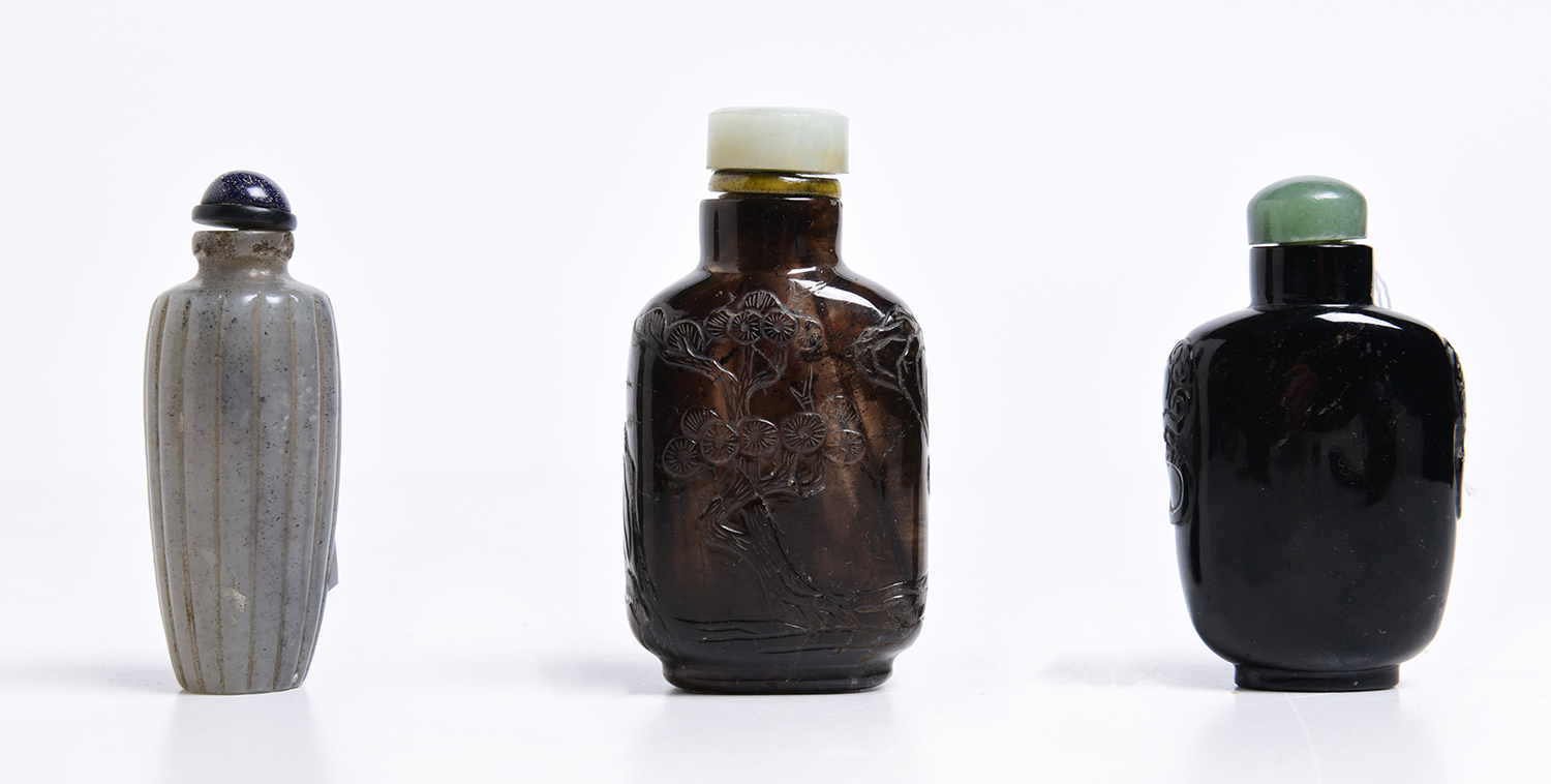 one of ribbed cylindrical form in jade, another in dark smoky quartz with lion mask handles, and the third in agate. Respective heights of 6.9 cm, 6.7 cm and 6.2 cm