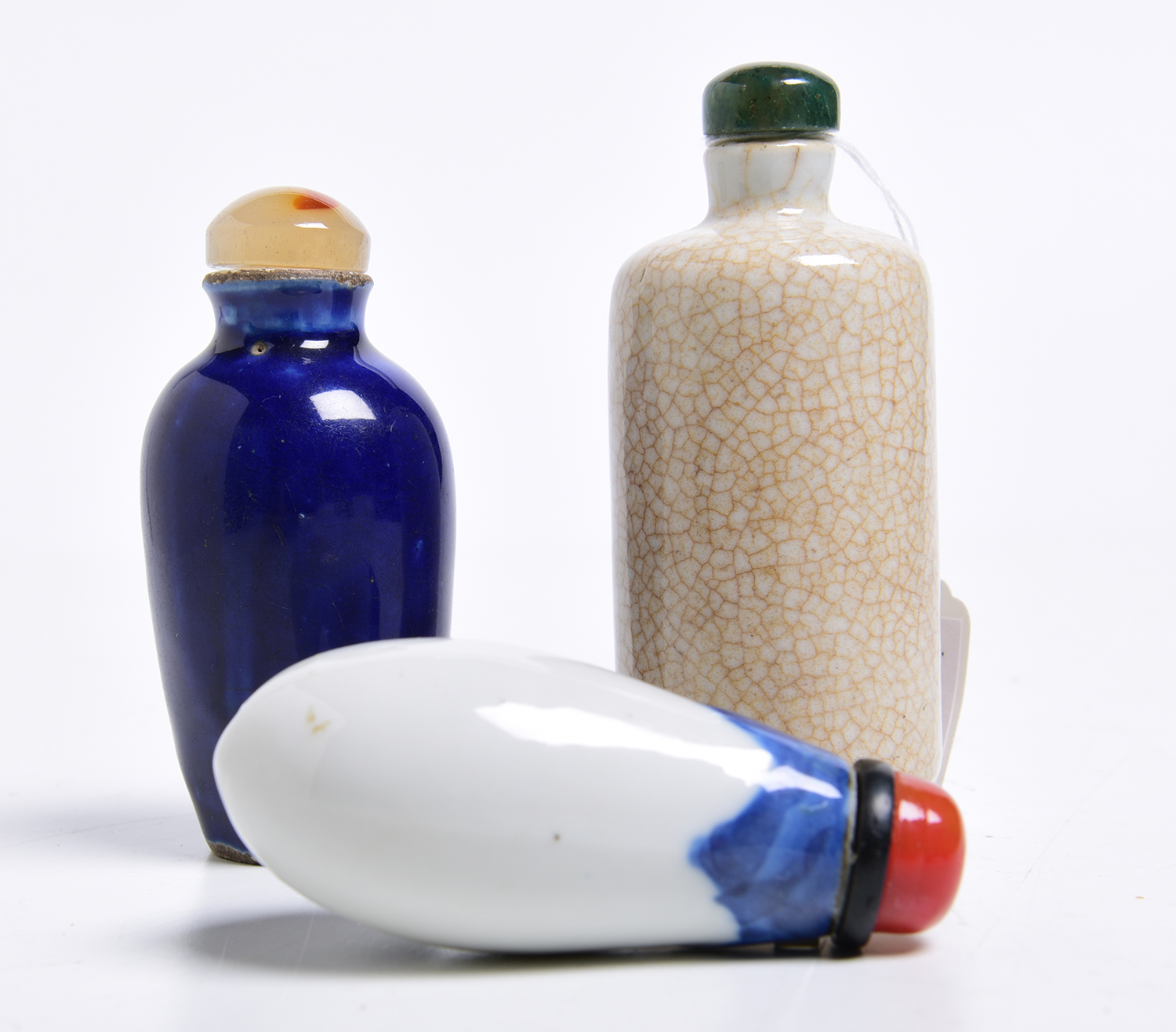 one cylindrical with a crackle glaze, another with a blue glaze, and the last of eggplant form in blue and white. respective heights of 8.8 cm, 7.5 cm and 7 cm