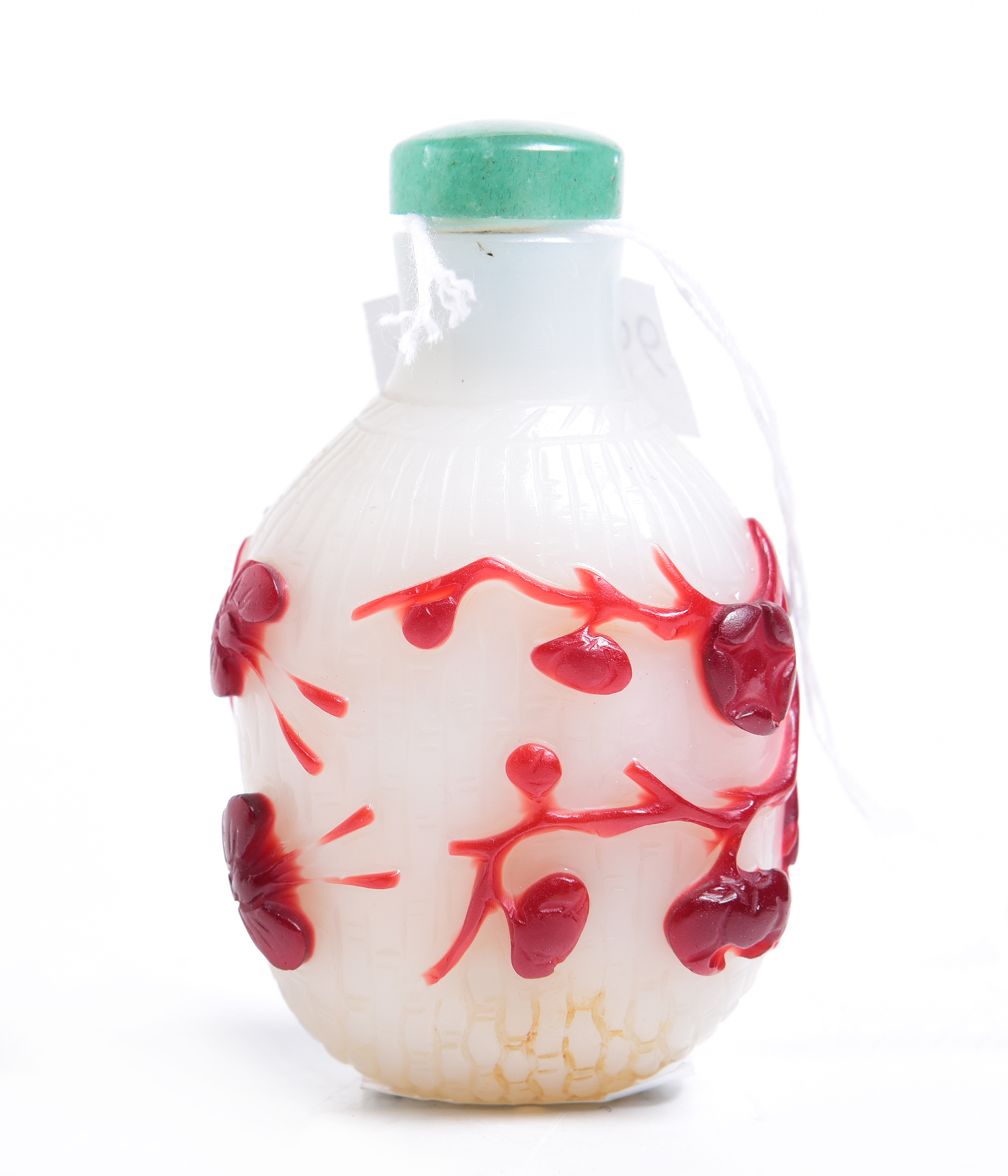 carved with red overlay decoration of butterflies and plum blossom over a white ground, carved to simulate a basket. 6.3 cm high, 3.8 cm wide, 3.1 cm deep