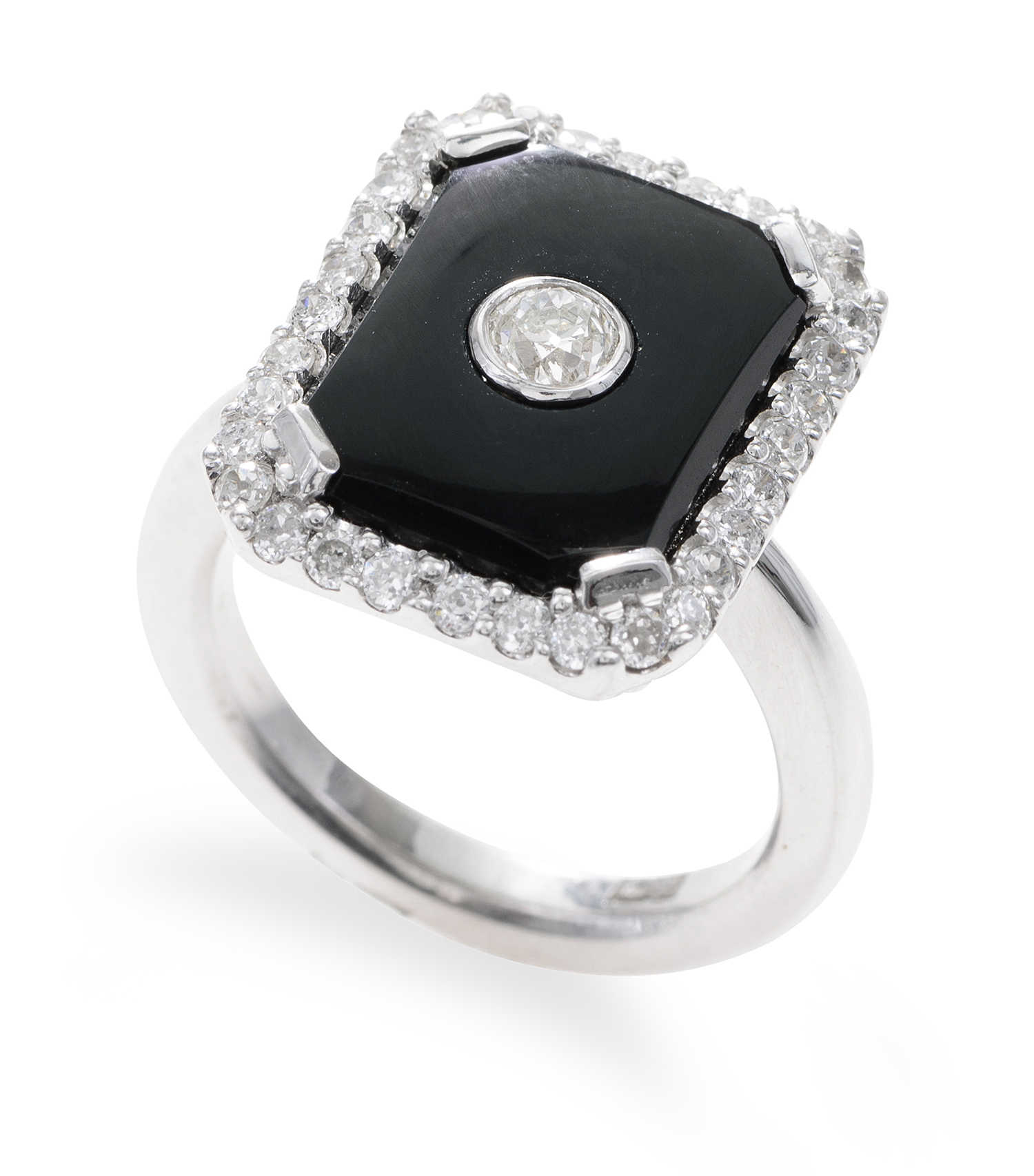 The rectangular onyx panel, centrally set with an old style vintage cut diamond of 0.22cts, with diamonds to the surround totalling 0.55cts, mounted in 18ct white gold, ring size M.
