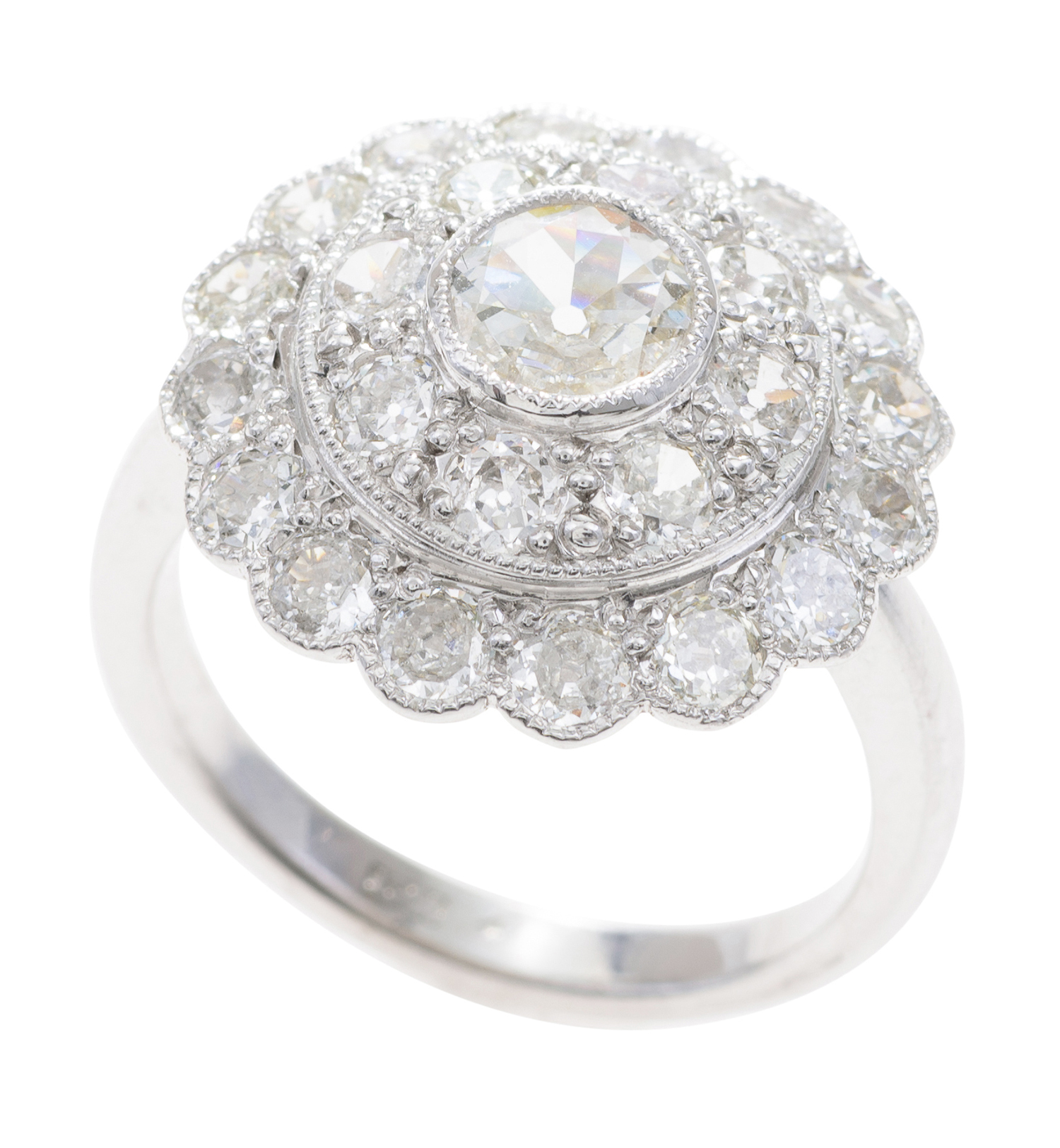 The old style vintage cut diamond of 0.54cts, surrounded by a double diamond halo totalling 2.50cts, mounted in 18ct white gold, ring size N.