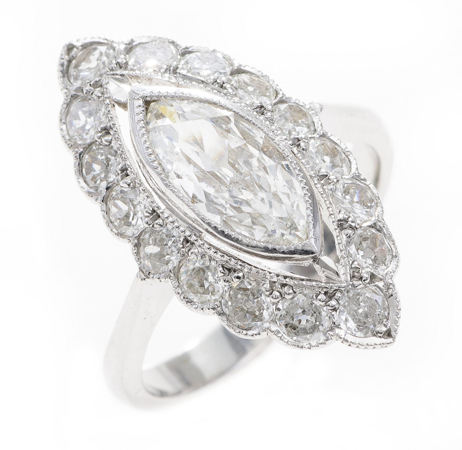 Comprising a marquise cut diamond of 1.00ct, surrounded by old style vintage cut diamonds totalling 1.10cts, mounted in 18ct white gold, ring size L.