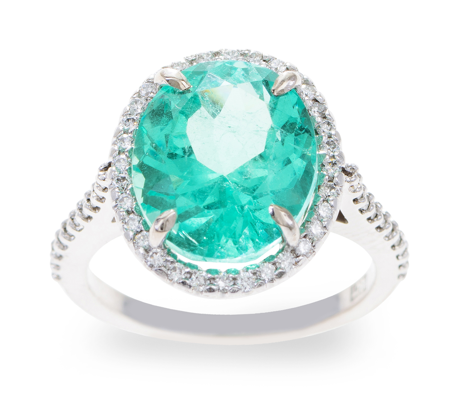 The oval faceted emerald of 6.65cts, surrounded and shouldered by diamonds totalling 0.39cts, mounted in 18ct white gold, ring size L.