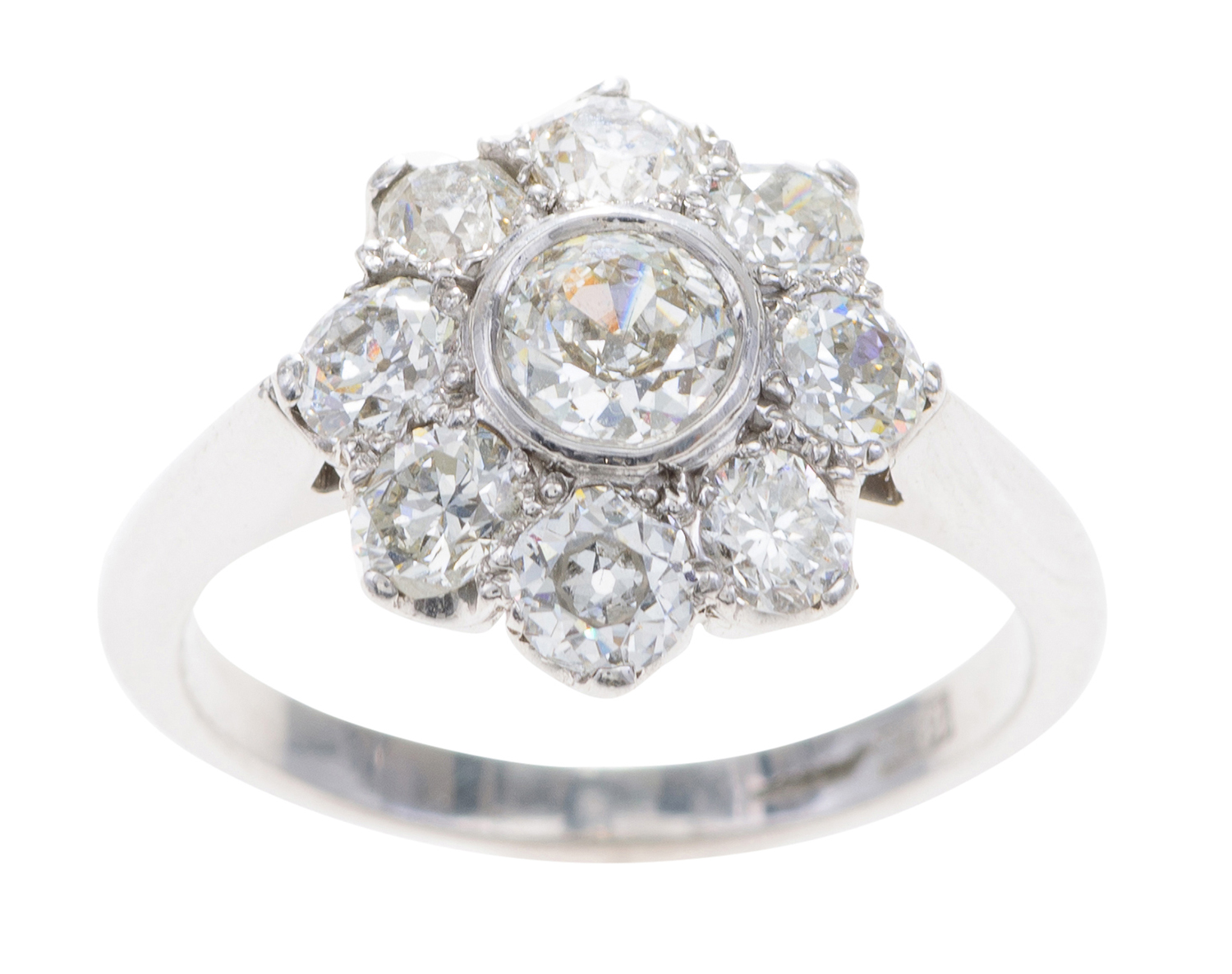 The central old style vintage cut diamond of 0.37cts, surrounded by eight further diamonds totalling 1.36cts, mounted in 18ct white gold, ring size L.