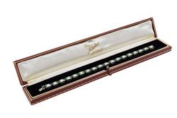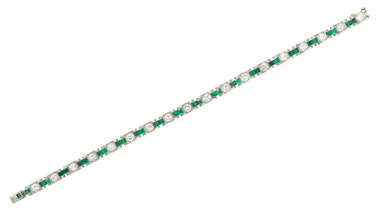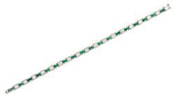 Comprising eighteen round brilliant cut diamonds totalling 4.50cts, alternating with square faceted emeralds, mounted in platinum, clasp signed Cartier London, total length 180mm, retailed by Philip Antrobus London, designers and manufacturers of the engagement ring of Queen Elizabeth II, boxed.