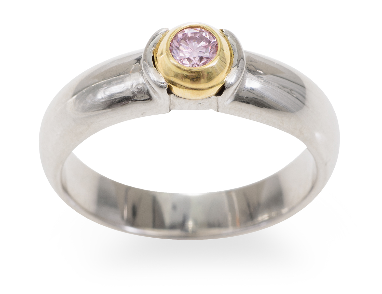Featuring a single pink round brilliant cut diamond totalling 0.19cts, mounted in 18ct white and yellow gold, ring size O.