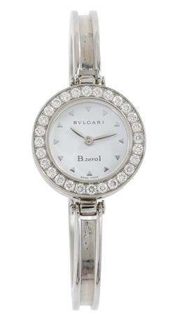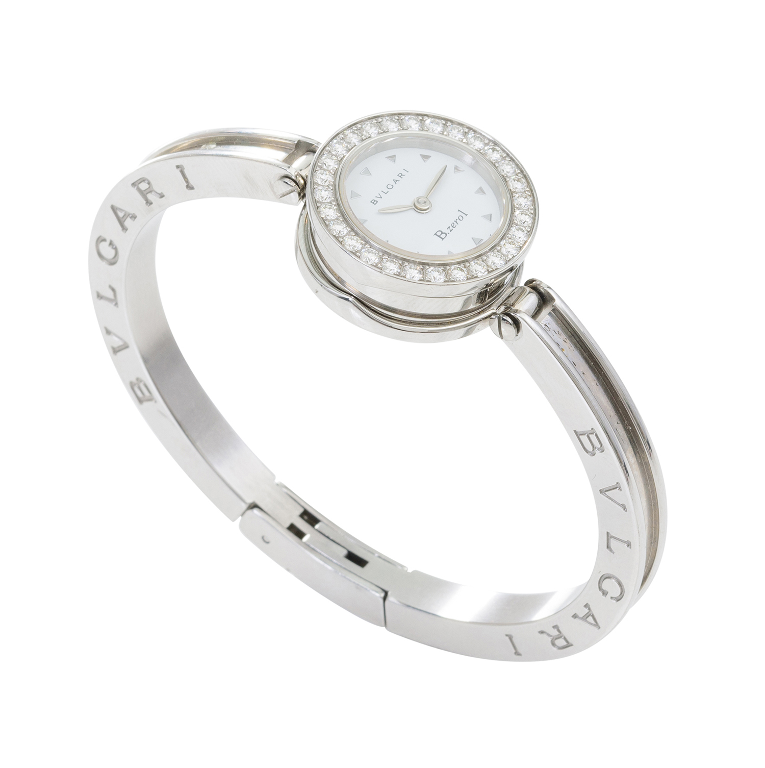 Quartz movement, rear set, circular white dial with baton numerals, signed case, dial and movement, diamond set dial with stainless steel case and stainless steel bracelet bands, reference number BZ 22 S / D185849, 22mm diameter.