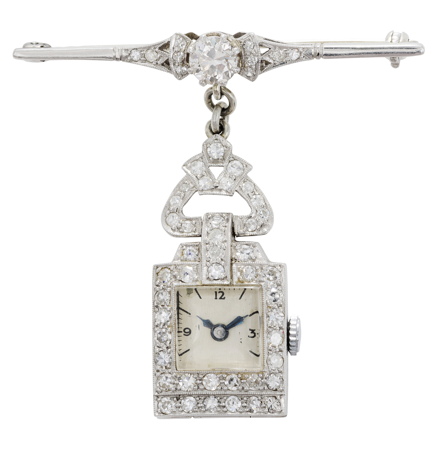 Having a sixteen jewel White Star movement, to a platinum diamond set case, suspended from a confirming bar brooch fitting, diamonds totalling 1.00ct, total length 50mm.