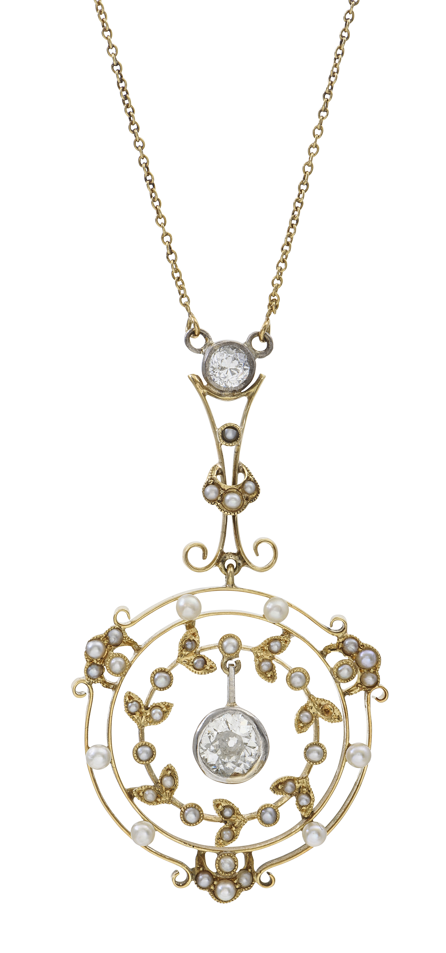Comprising two old European cut diamonds totalling 1.00ct, open circular and scroll design, pearl set leaves, suspended from an integral trace link chain, mounted in 15ct gold, total length 410mm.