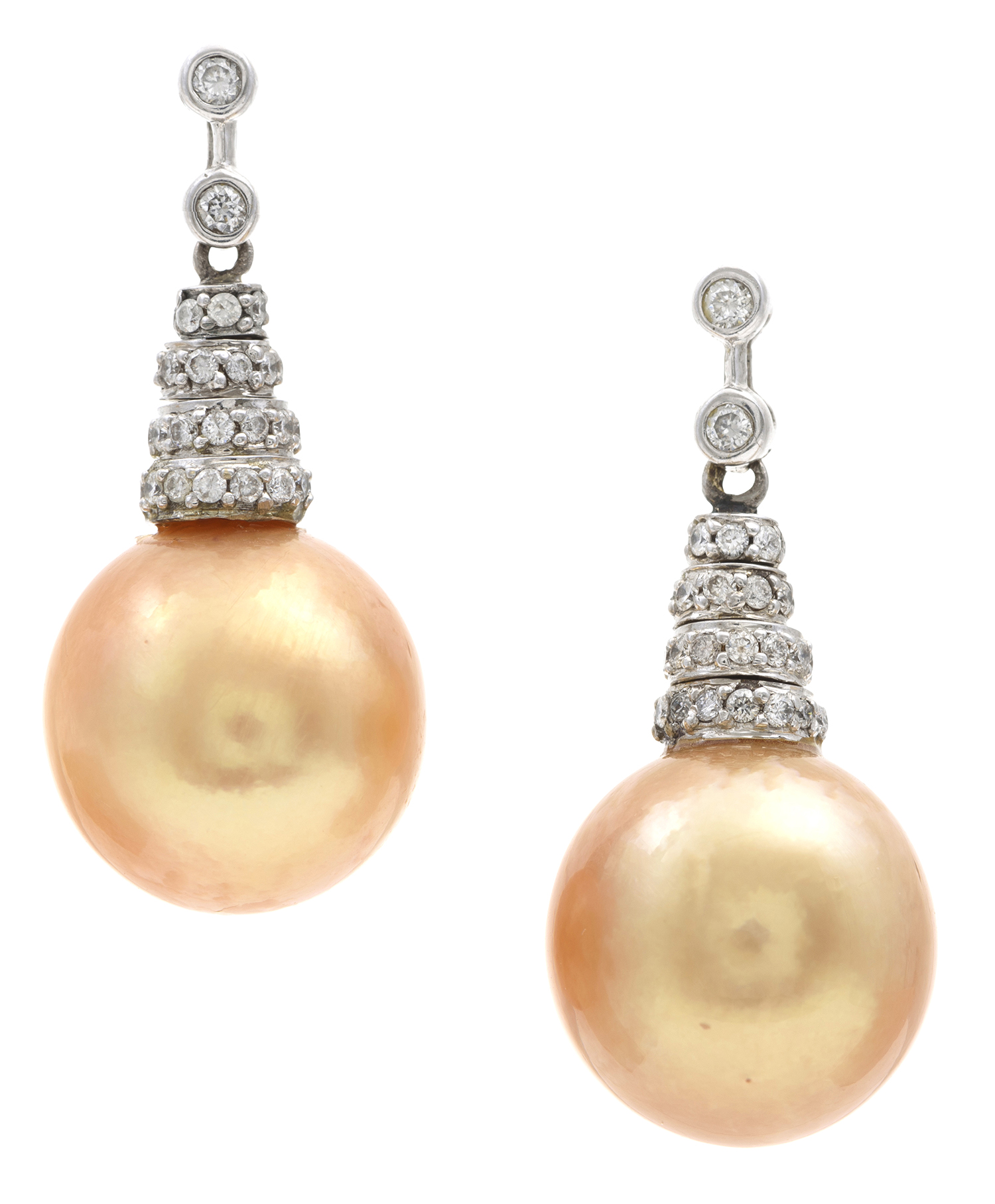 Each featuring a pearl of deep golden hues measuring 13mm, suspended from a diamond set cap and articulated diamond drop totalling 0.15cts, mounted in 18ct white gold,.