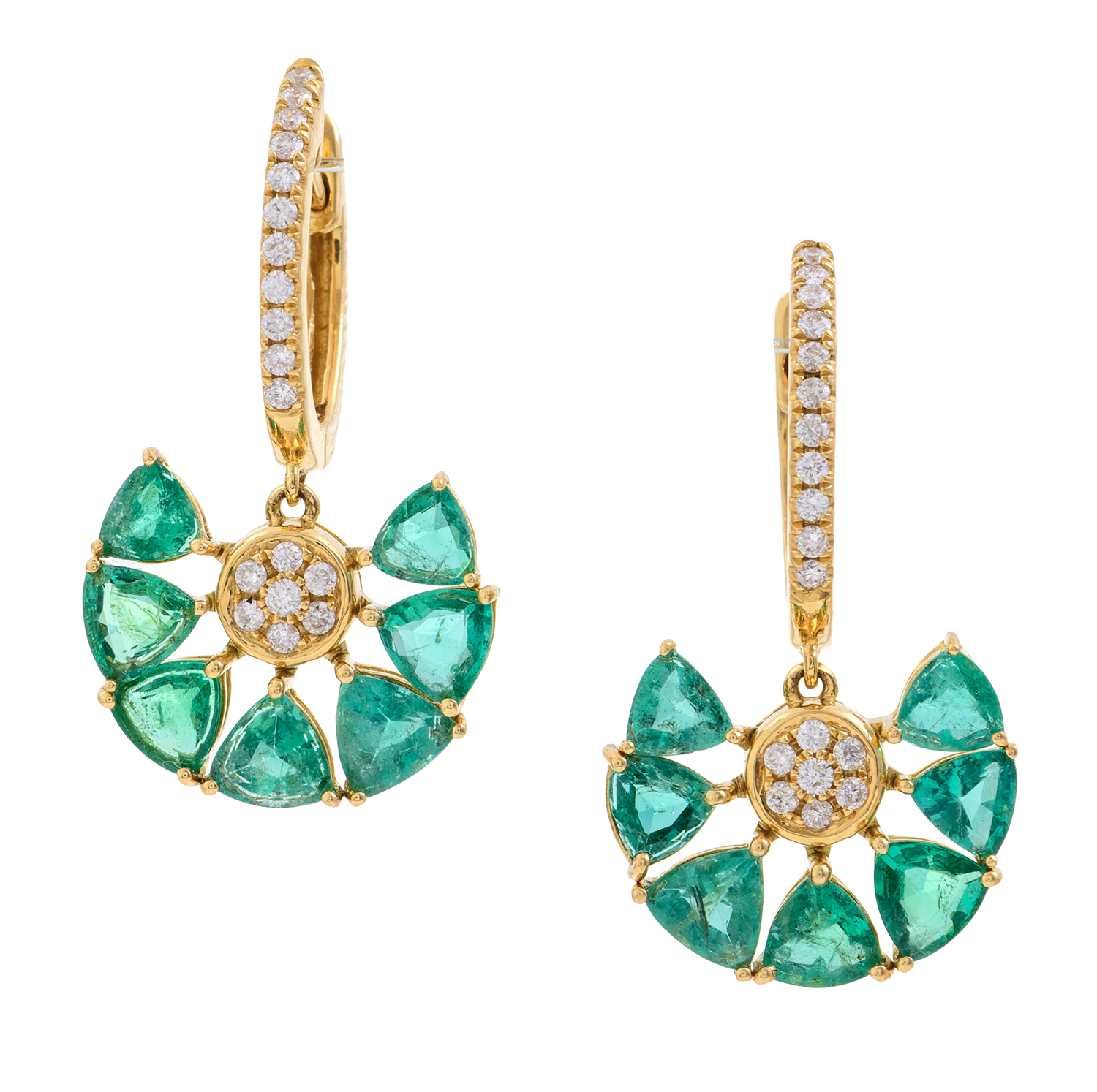 Comprising articulated emerald and diamond flowers, suspended from half diamond set hoops, total emerald weight 2.69cts, mounted in 18ct gold.