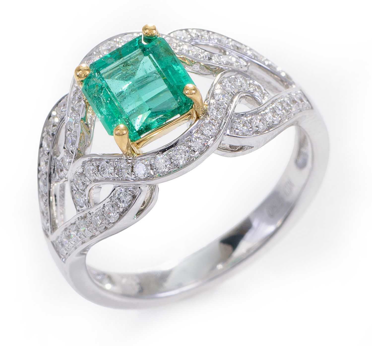 Centrally set with a square faceted emerald of 1.11cts, within an open scrolled diamond setting totalling 0.42cts, mounted in 18ct white and yellow gold, ring size M.