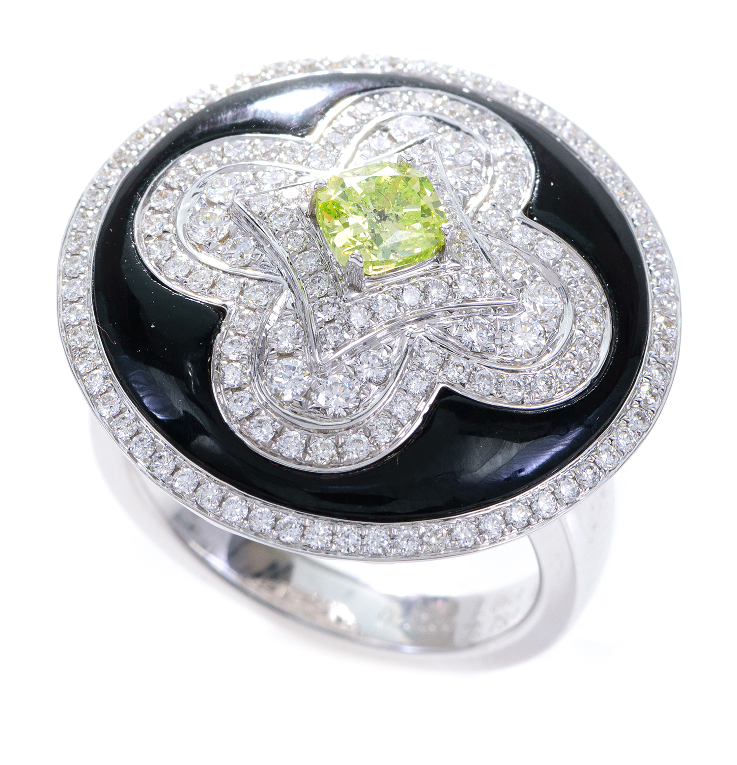 The circular onyx plaque centrally set with a faceted green diamond of 0.52cts, within a central diamond set panel and border, mounted in 18ct white gold, ring size L.