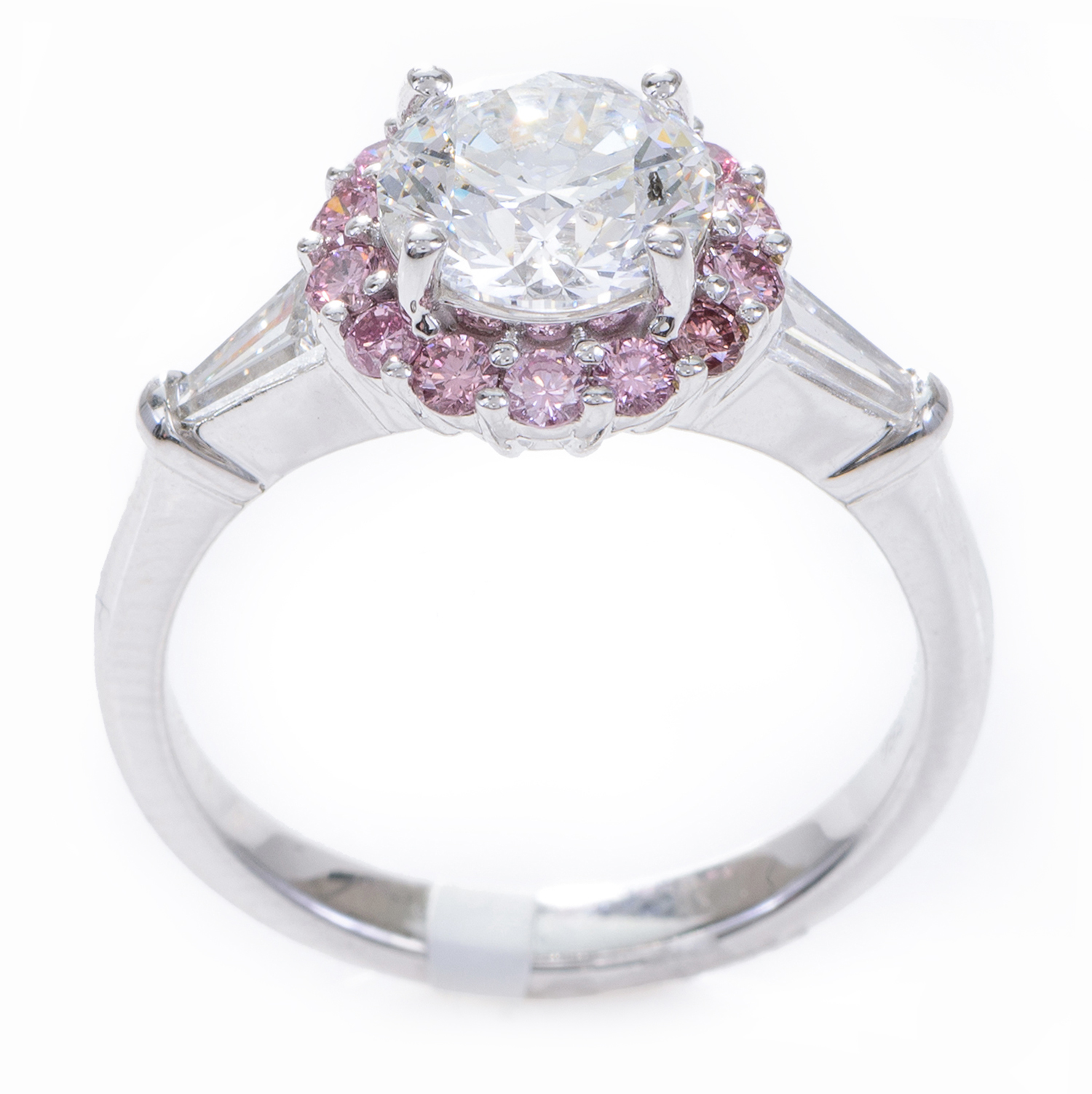 Featuring a round brilliant cut diamond of 1.52cts, surrounded by a pink diamond halo totalling 0.37cts, with tapered baguette diamond shoulders of 0.33cts, mounted in 18ct white gold, ring size M.