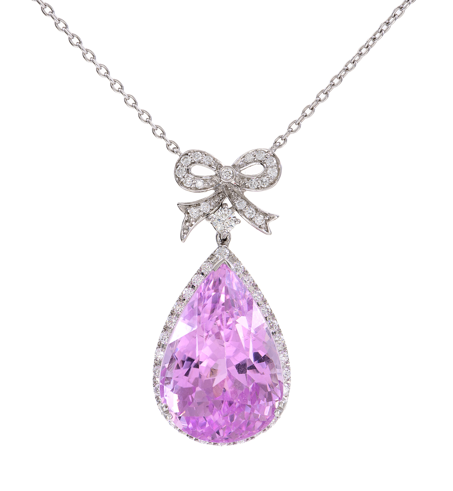 Featuring a fancy pear shaped kunzite of 30.66cts, surrounded by round brilliant cut diamonds, suspended from a diamond set bow, all totalling 0.86cts, mounted in 18ct white gold, on an integral curb link chain, total length 430mm.