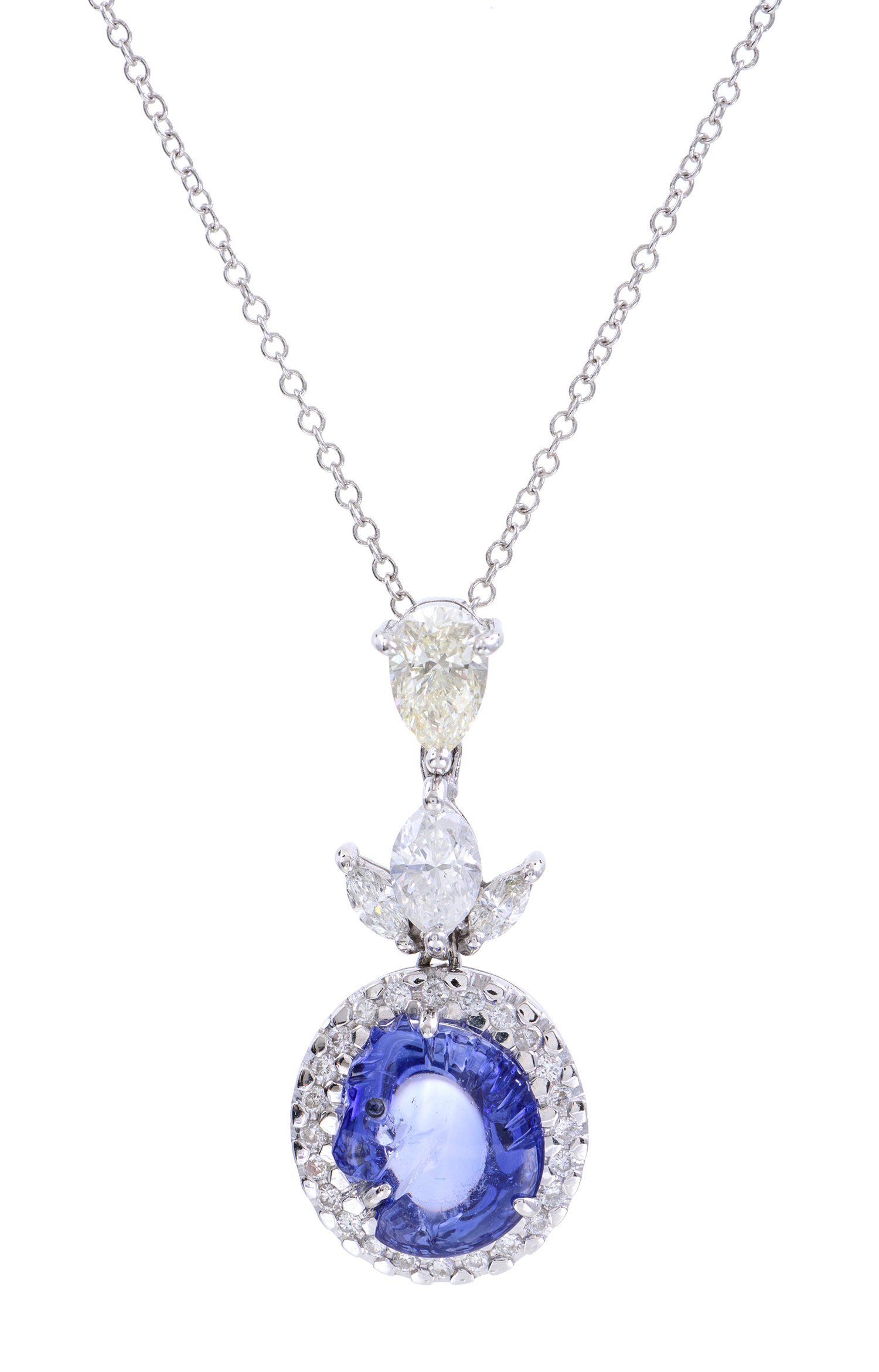 The pendant presents in excellent condition. All stones secure in their settings. Diamonds are of a good commercial grade and quality. The carved sapphire is translucent with minor inclusions.