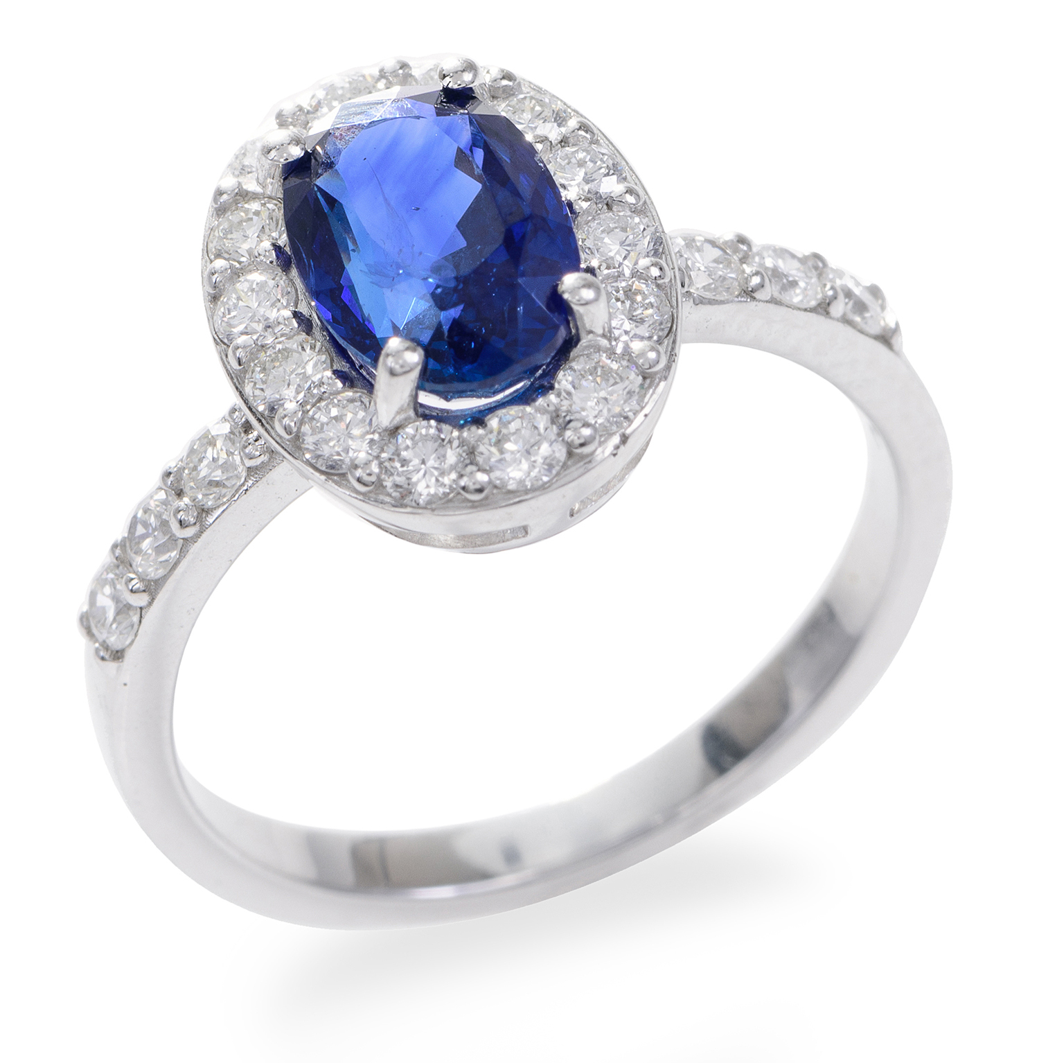 The oval faceted sapphire of 2.31cts, surrounded and shouldered by round brilliant cut diamonds totalling 1.00ct, mounted in 18ct white gold, ring size O, sapphire accompanied by GIA report number 6185241413 stating origin Kashmir and no evidence of heat treatment.