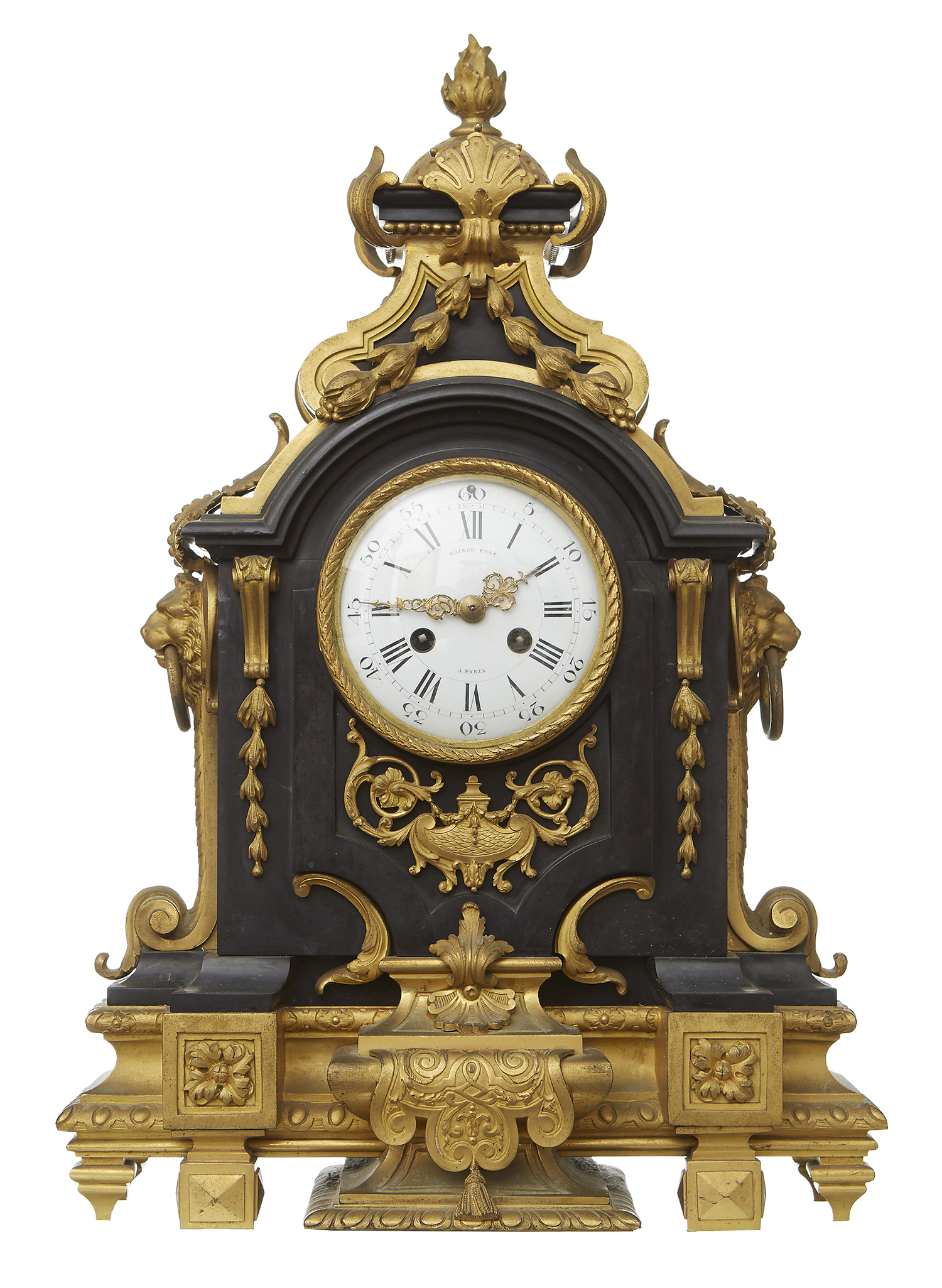 Of architectural form with ormolu mounts and twin acanthus handles with cast mask attenuation and drop rings, the enamelled circular dial with Roman numerals and Arabic outer numerals, with hour and half hour striker, on ormolu base. 54 cm high.