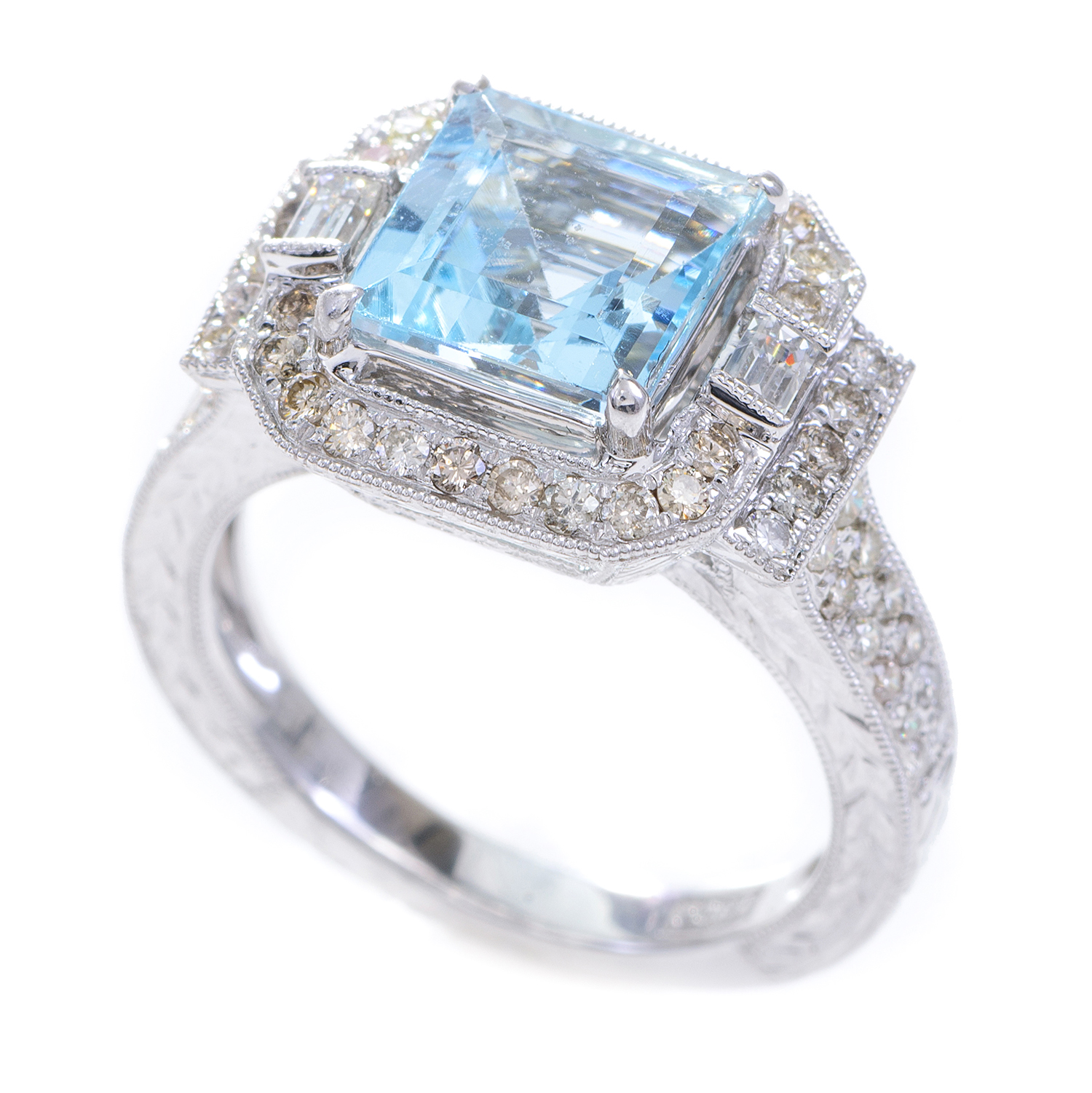 Set with a square cut aquamarine of 1.64cts, within a diamond surround and shoulders totalling 0.69cts, to an etched band and gallery, mounted in 18ct white gold, ring size O.