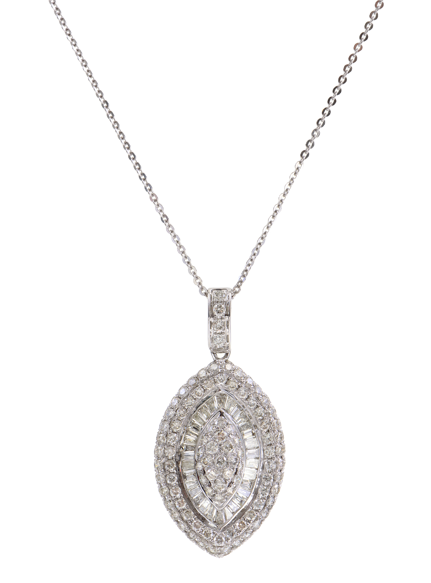 Pavé set with round brilliant cut diamonds totalling 1.05cts and baguette cut diamonds totalling 0.39cts, mounted in 18ct white gold to a conforming chain.