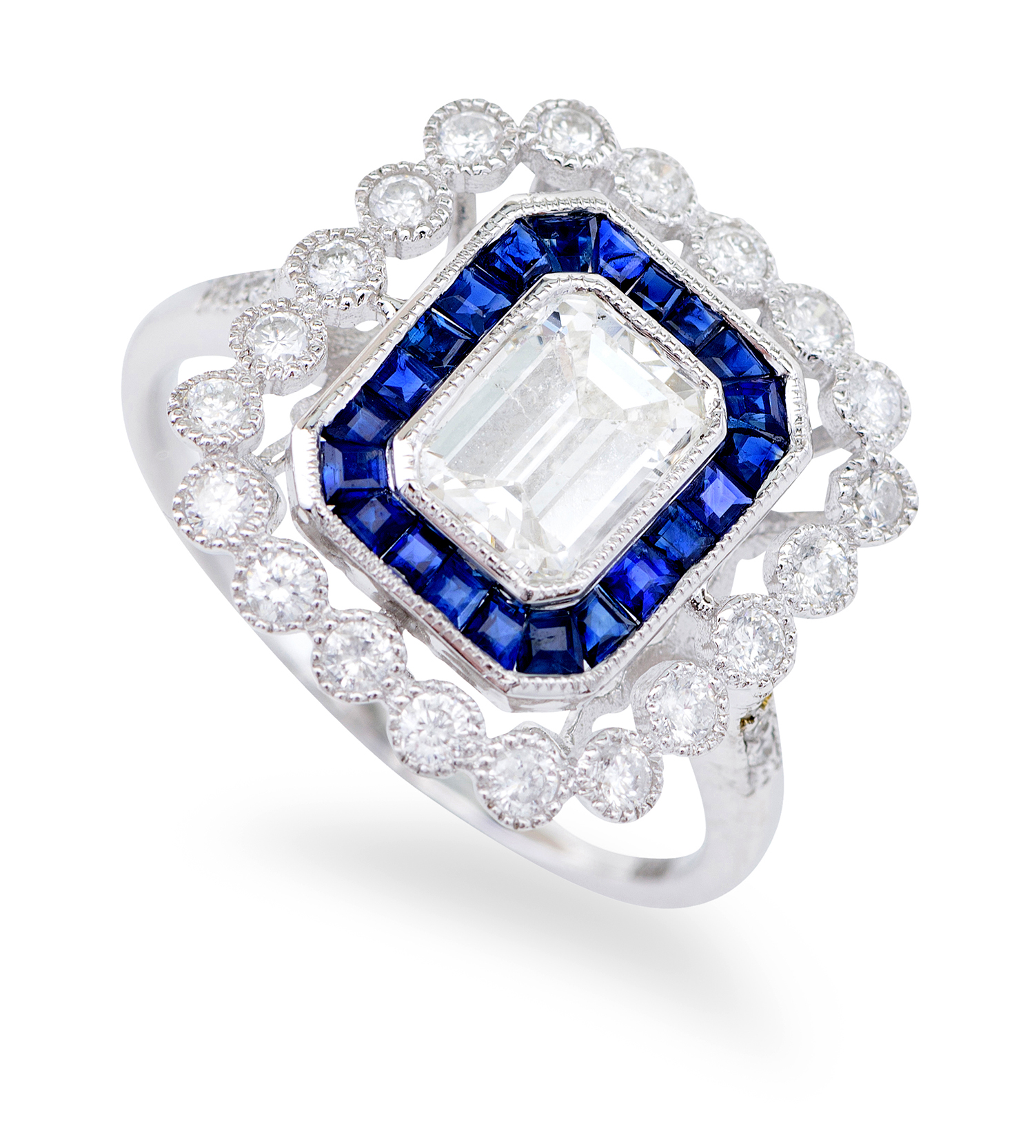Centrally set with a rectangular emerald cut diamond of 1.01cts, within a border of calibre cut sapphires totalling 0.68cts, surrounded by an outer border of round brilliant cut diamonds totalling 0.51cts, mounted in 18ct white gold, ring size N.