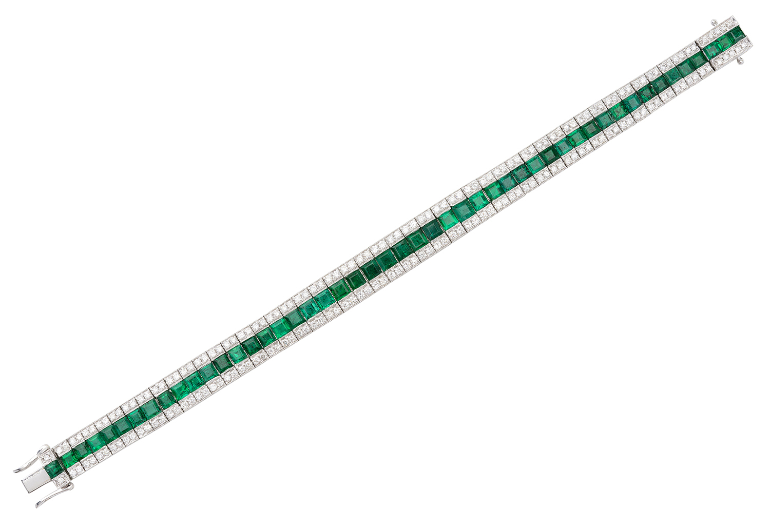 Centrally set with a row of square cut emeralds totalling 9.24cts, within a border of round brilliant cut diamonds totalling 2.32cts, mounted in 18ct white gold, total length 165mm.