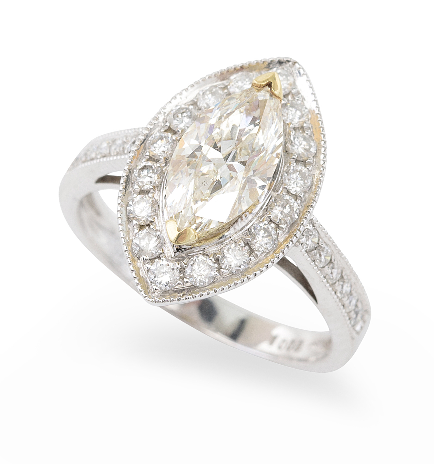 The ring presents in excellent condition, all stones secure in their settings. Marquise cut diamond of 1.02cts graded as L-M in colour, SI1 clarity.