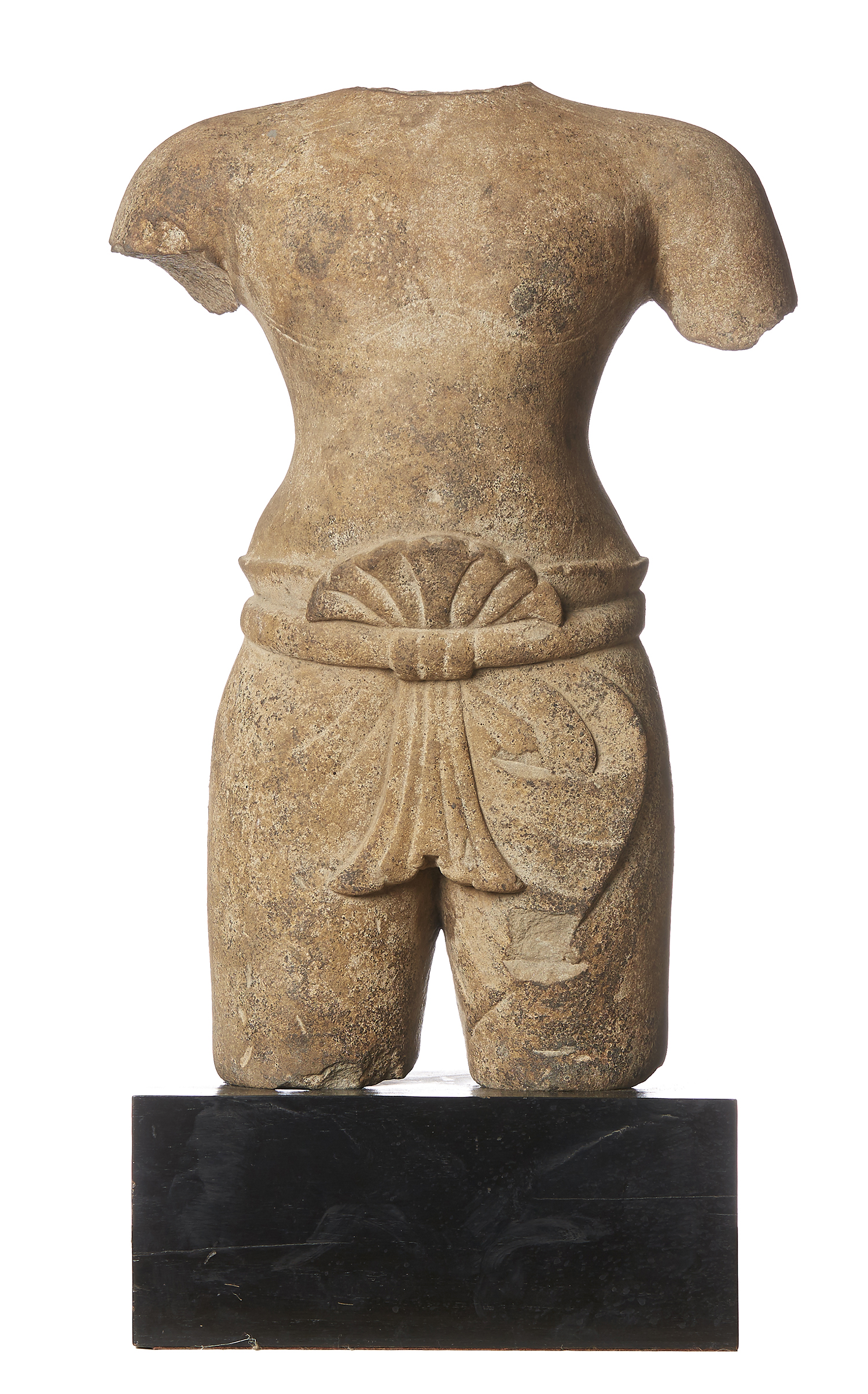 The sandstone torso with fine detailing, including an elaborately tied dhoti around the waist