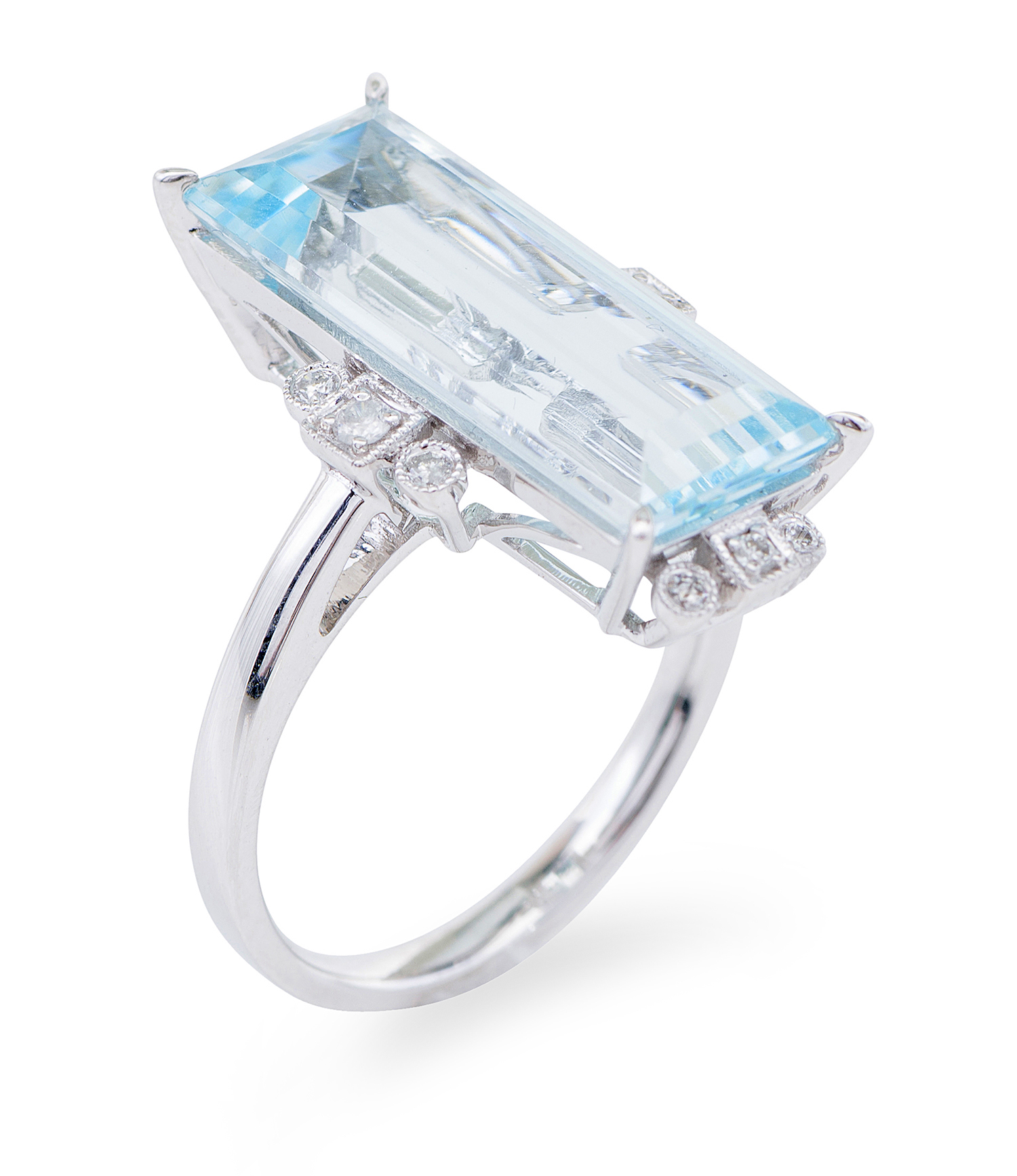 The emerald cut aquamarine of 7.14cts, with diamond detail to the surround, mounted in 18ct white gold, ring size N.