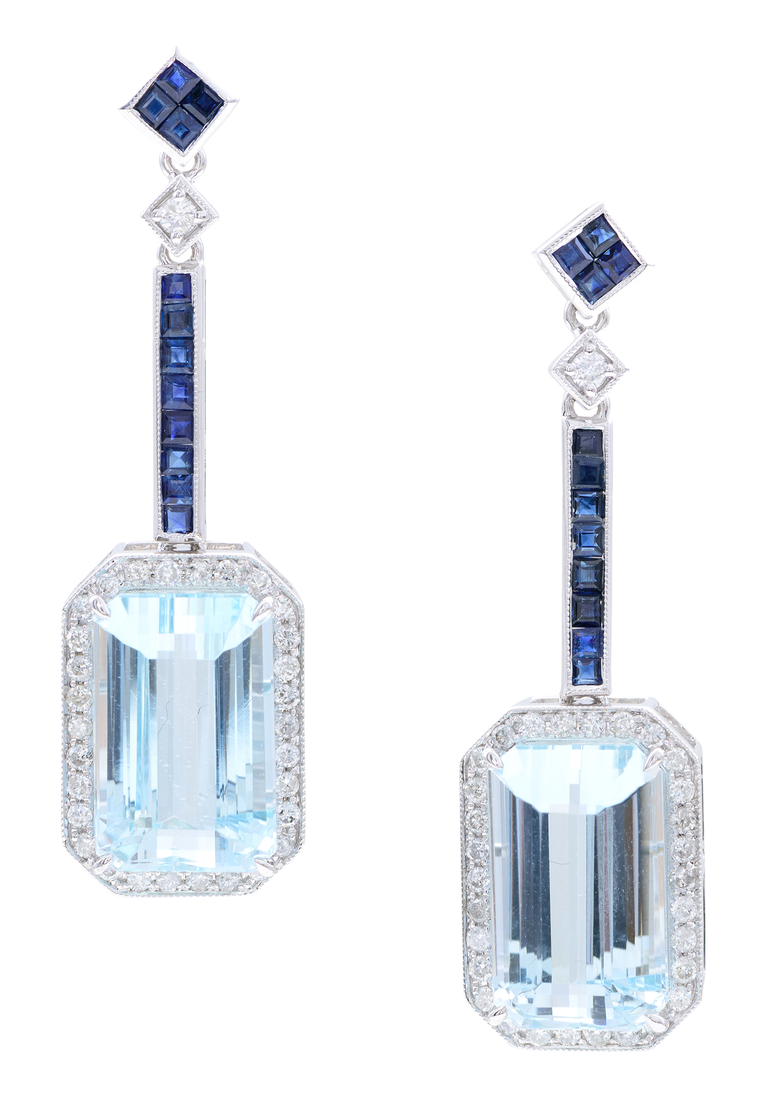 Featuring two rectangular step cut aquamarines totalling 16.48cts, diamond set border and drop totalling 0.73cts, sapphires totalling 1.04cts, mounted in 18ct white gold.