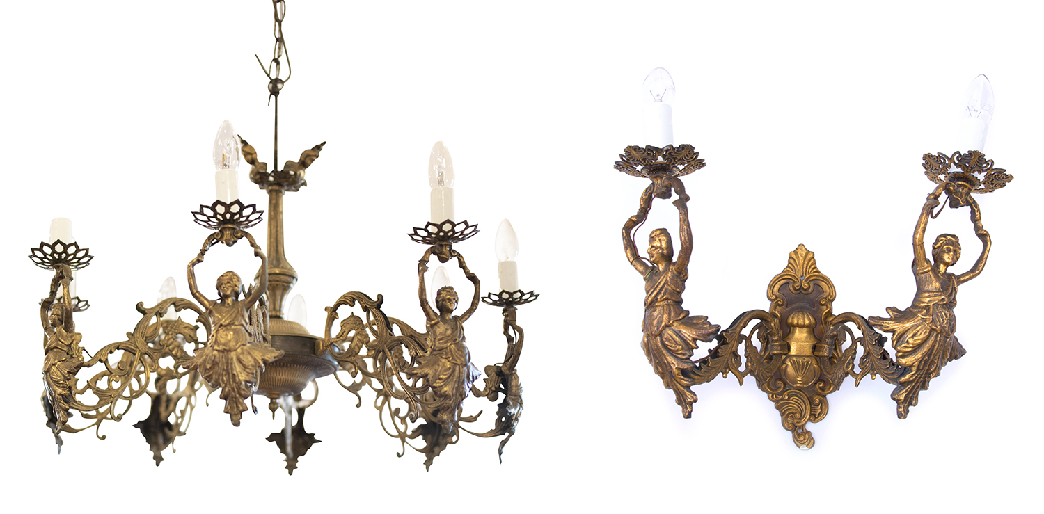 A BRONZE FIGURATIVE CHANDELIER & MATCHING WALL SCONCE
