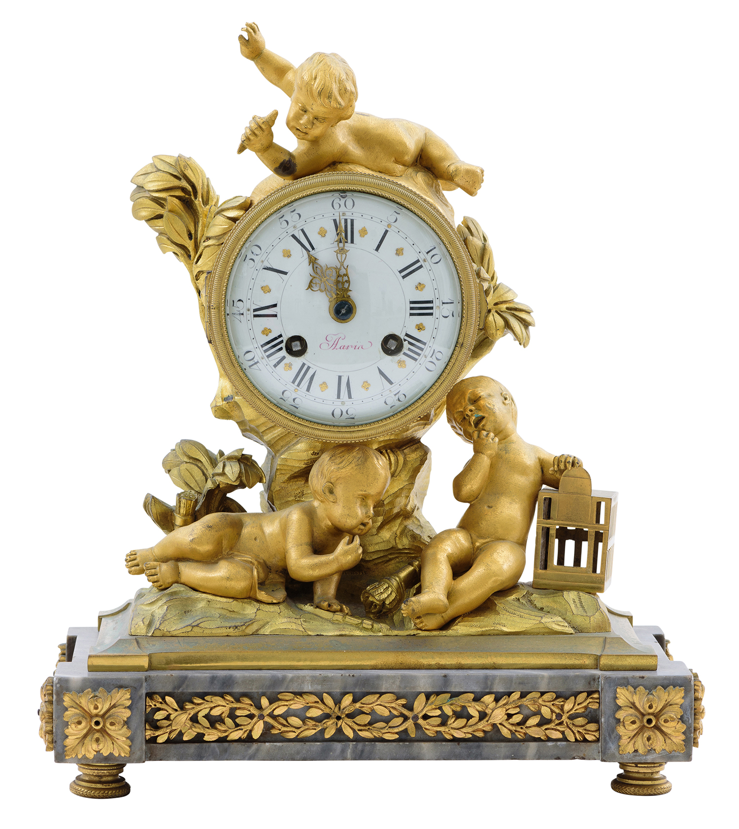 enamel face marked 'Haria', adorned with three gilt putti and mounted on a marble platform base
