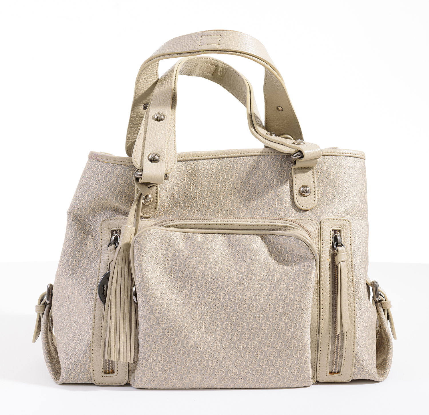 Styled in beige fabric with 'GA' monogram repeated, beige leather trim and silver metal hardware, 24 x 34 x 15cm.