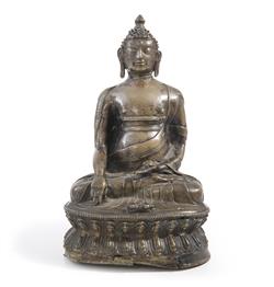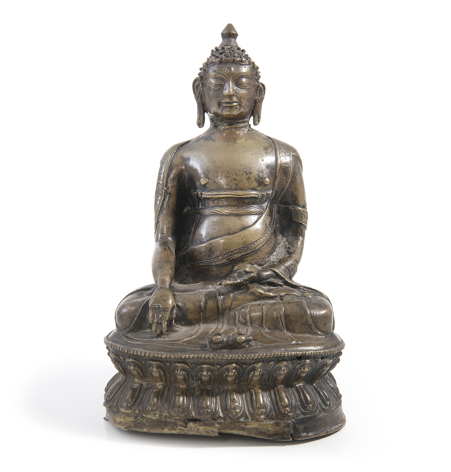 The figure of the historical Shakyamuni Buddha seated in padmasana atop a double lotus base, with the right hand in bhumisphara mudra, wearing an elaborate dhoti and patchwork cloth, with high pointed ushnisha and a dorje/vajra resting before the figure.