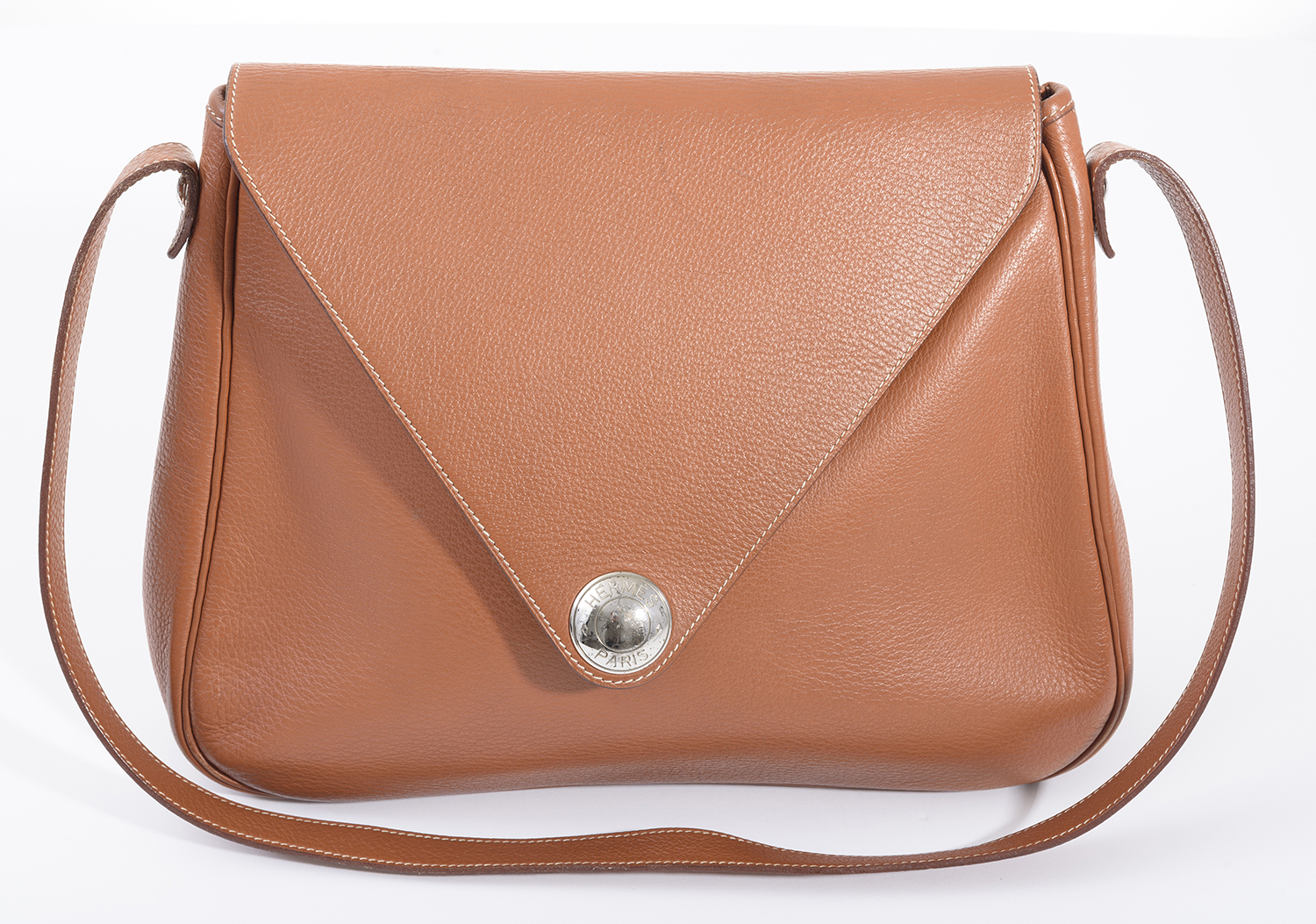 Styled in Etrusque Clemence leather with white contrast stitching and silver metal clasp on flap closure, stamped 'B' within a box and 'P' within a circle, 27 x 35 x 8cm.
