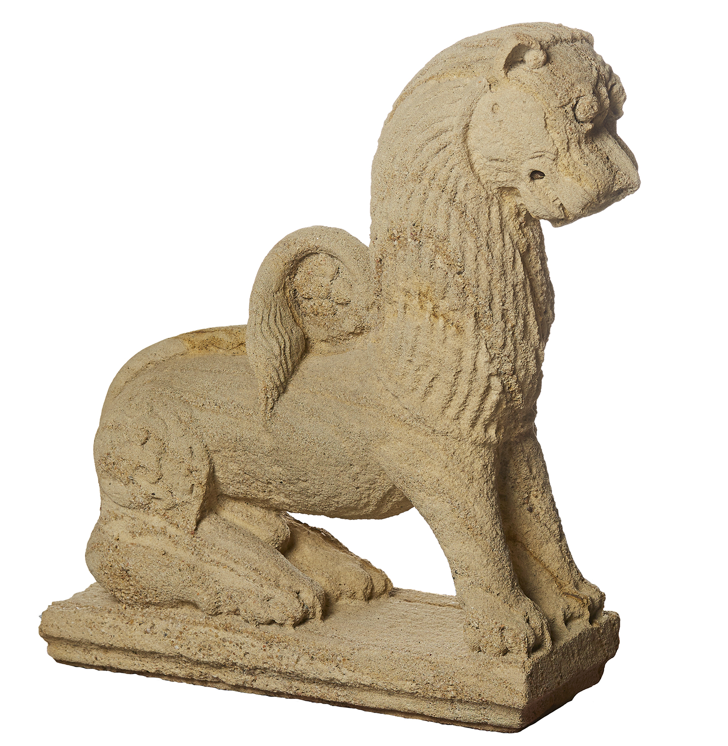 The sandstone lion resting on its hind legs in an upright position, with finely detailed mane and tail